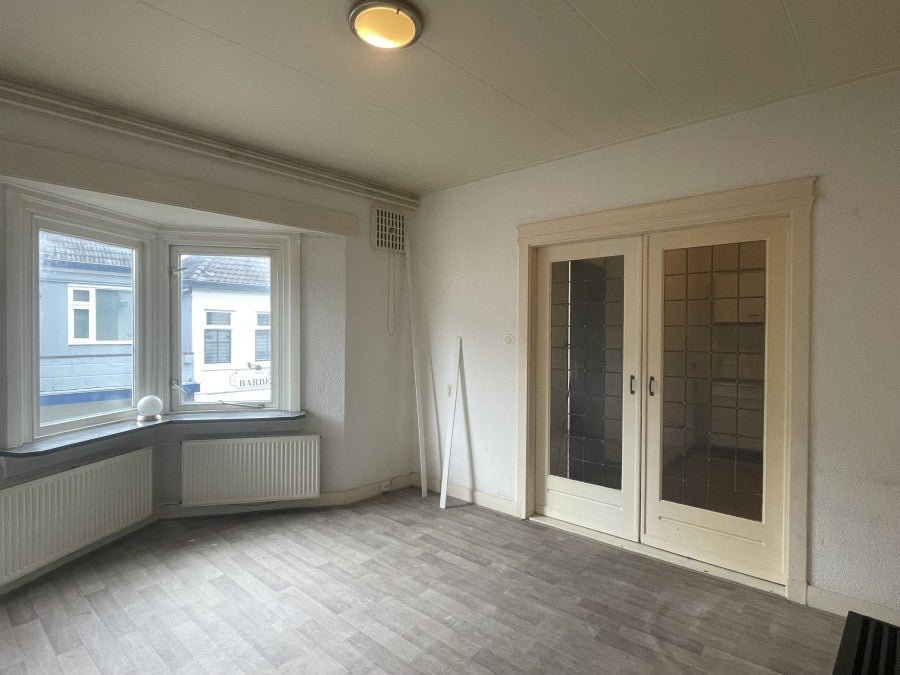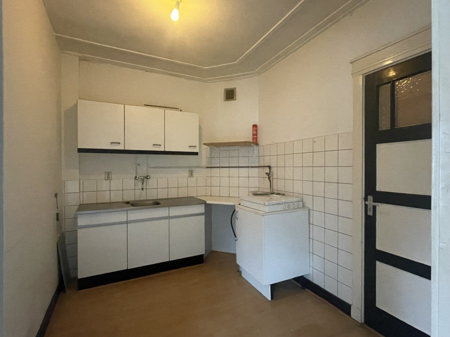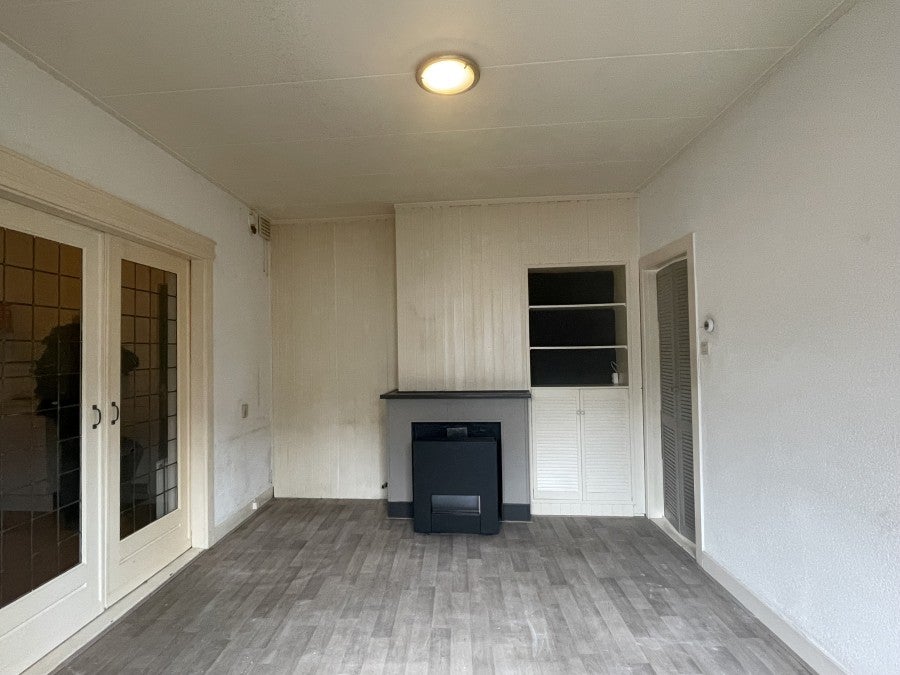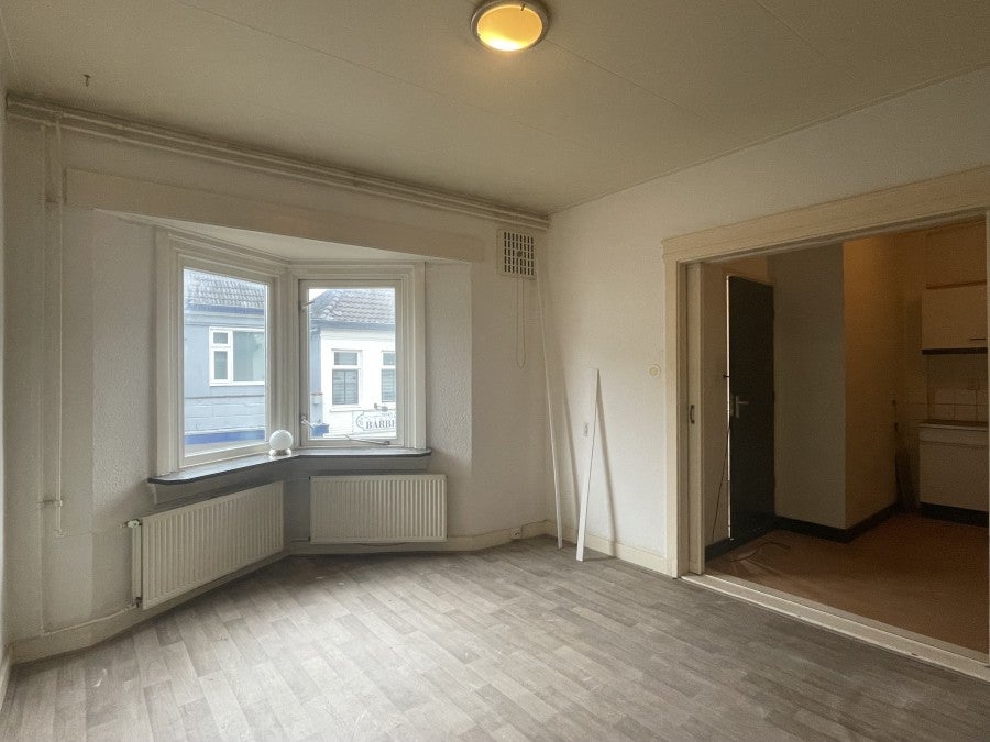 Lichte woonkamer met doorgang naar de keuken welke afgesloten kan worden door schuifdeuren. Vanuit de keuken bereik je de badkamer met douche, wastafel, toilet en wasmachine aansluiting. Vanuit de andere kant van de woonkamer heb je toegang tot de ruime slaapkamer.