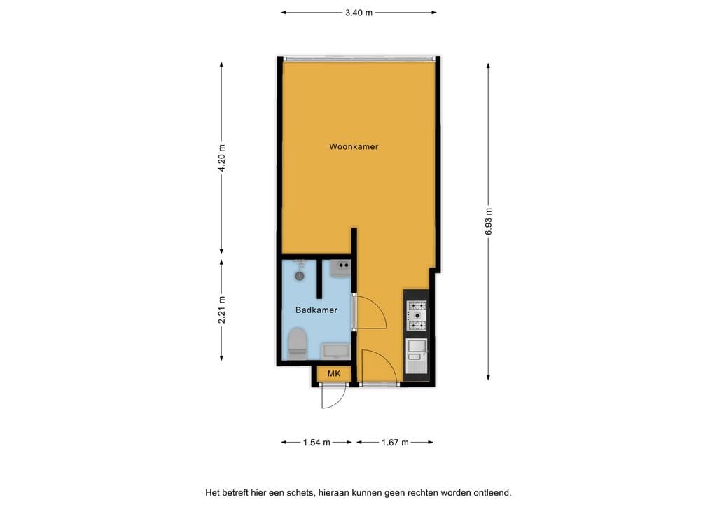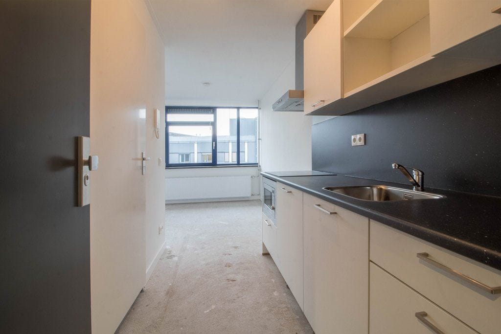 Indeling: entree, badkamer met douche, toilet en wastafel, woon-slaapkamer met open keuken voorzien van koelkast, magnetron, kookplaat en afzuigkap.