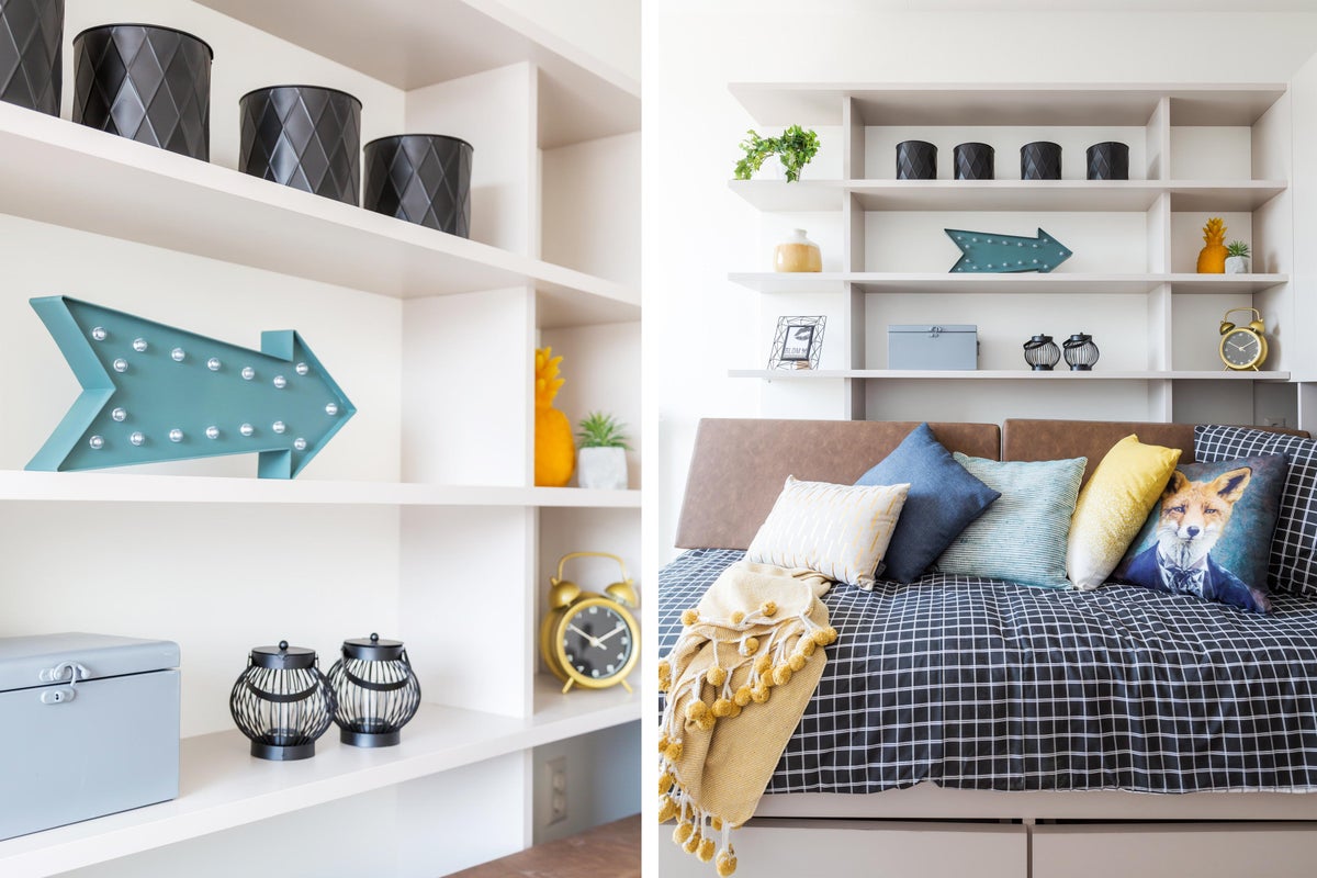 Inclusief meubilair: bed (om te bouwen tot bank), kast, tafel en stoelen