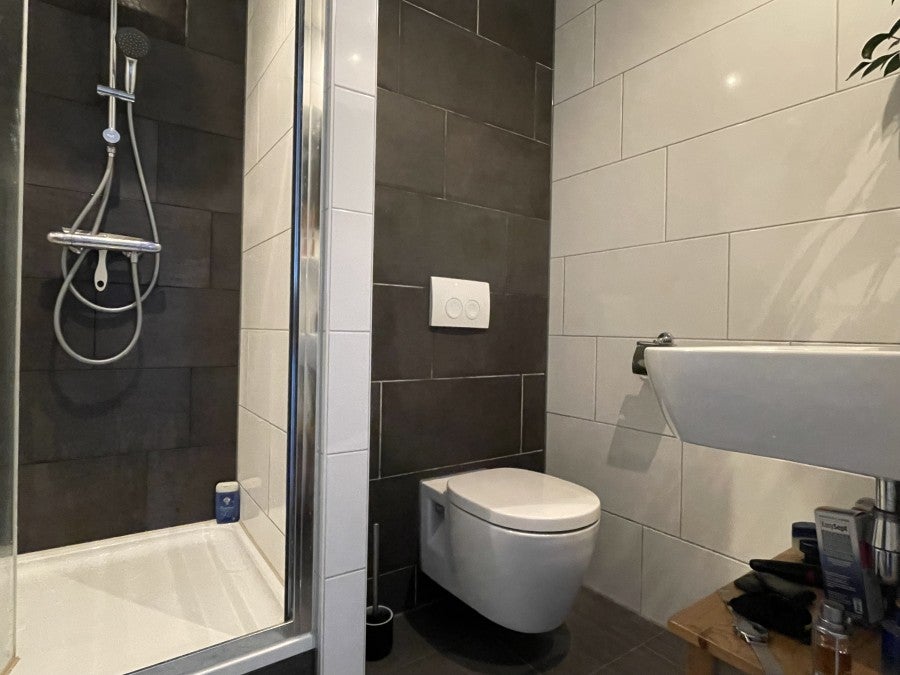 De badkamer is strak afgewerkt en voorzien van een zwevend toilet, een douche met douchegarnituur en een glazen douchescherm.