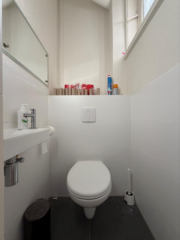 De badkamer bevindt zich op de eerste verdieping en is voorzien van een douche en een wastafel met bijbehorend kastje. Tot slot beschikt de woning over een gemeenschappelijke balkon.