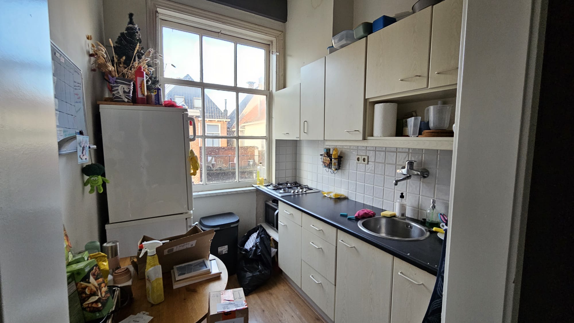 Je hebt een gezamenlijke ingang met een trap naar boven. Rechts bevindt zich de gezamenlijke keuken. Je deelt de keuken, badkamer en het toilet met drie medebewoners.