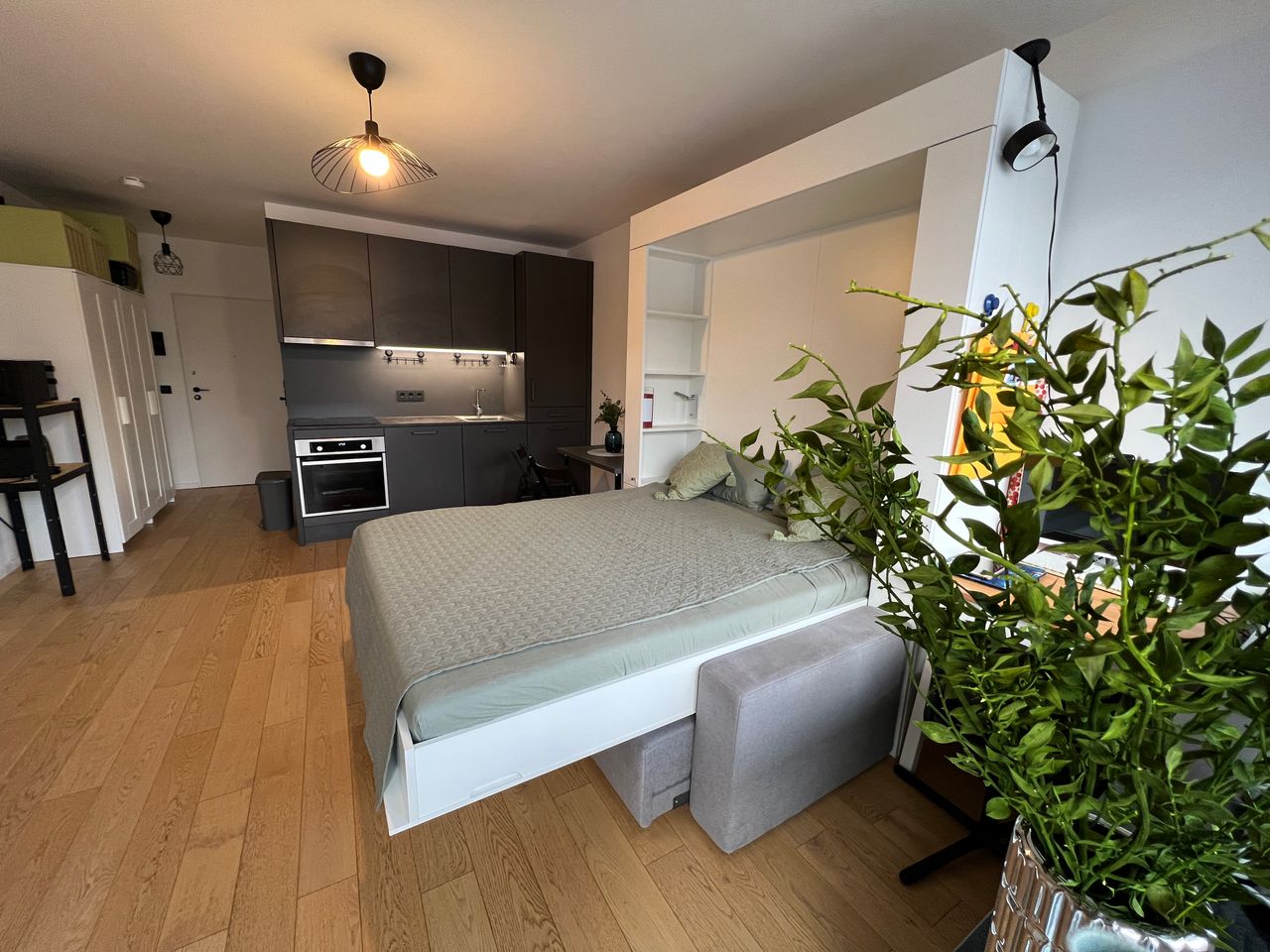 Studio-appartement met panoramisch balkon en volledig uitgeruste keuken en badkamer.