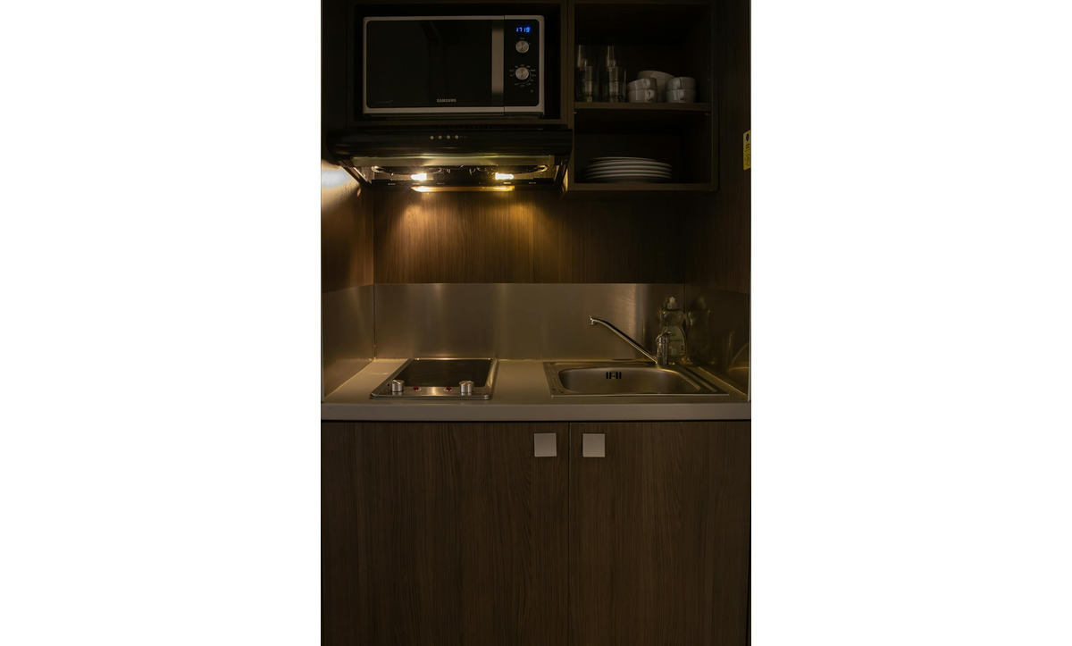 Verblijf in een studio voor 2 personen met een tweepersoonsbed en een praktisch keukentje met o.a. waterkoker, koffiezetapparaat, koelkast, magnetron en kookplaat. Handdoeken en haardrogers zijn aanwezig in elke eigen badkamer (douche of bad). Er is ook gratis WiFi.