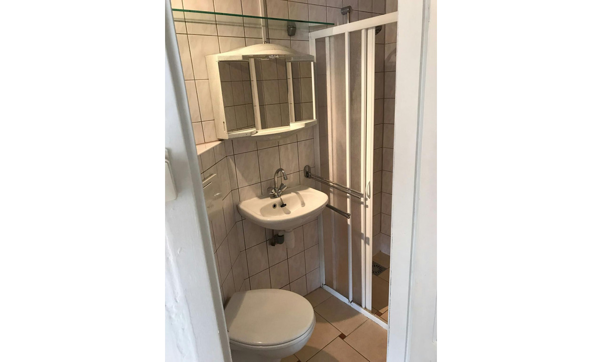 De badkamer heeft een douche en een toilet.