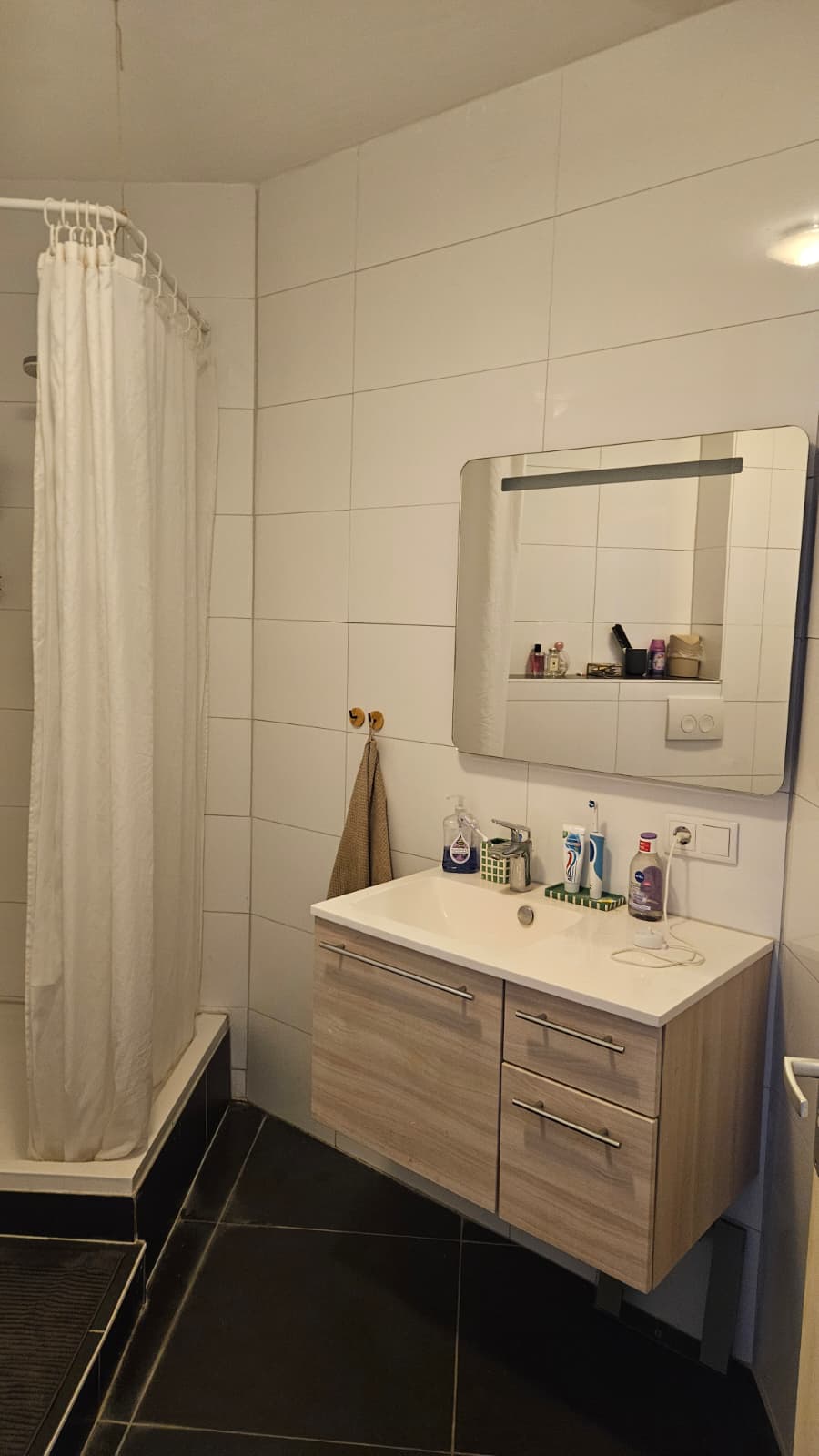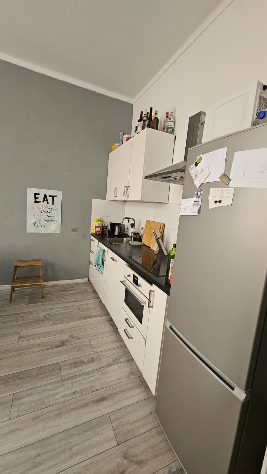 The room is large (~26m2), with high ceilings and large windows that look down onto the street. The house is located right in the centre of Enschede so it's easy access to the Oude Markt, plenty of shops including grocery stores, and the market. It's a shared livingroom/kitchen(with dishwasher!), bathroom with toilet and shower, and a small utility room. The room is unfurnished but my housemate is looking to sell you some of the furniture you can see in the photos, including the curtains and the two white cabinets.
