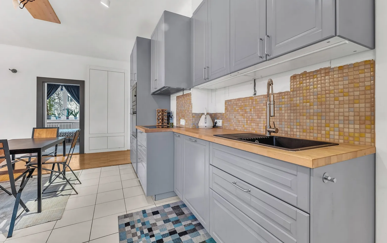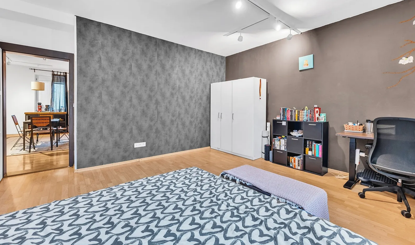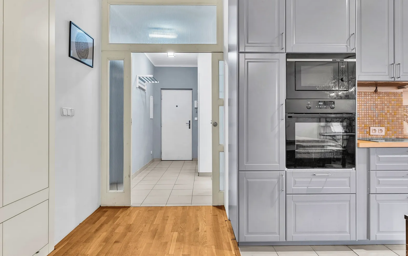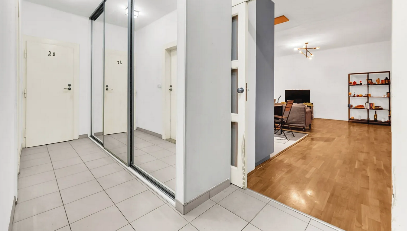Twee aparte, ruime slaapkamers, een gedeelde en zeer ruime woonkamer met kitchenette. Vanuit de hal is er een aparte ingang naar de badkamer, en het toilet is ook apart. Het appartement is perfect voor gezinnen en "huisgenoten".