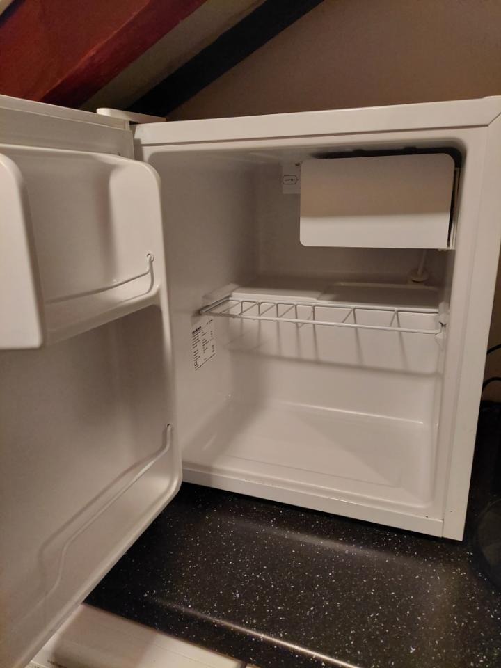 De kamer is volledig ingericht met bed, bureau, ladekast en kledingkast. Verder heb je een eigen koelkastje.