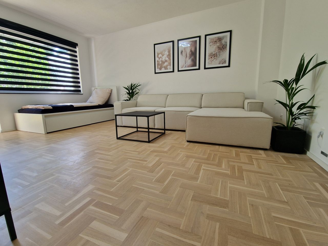 De woonkamer is voorzien van een lichte parketvloer van hoge kwaliteit.