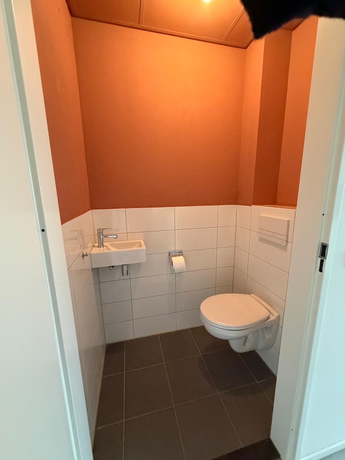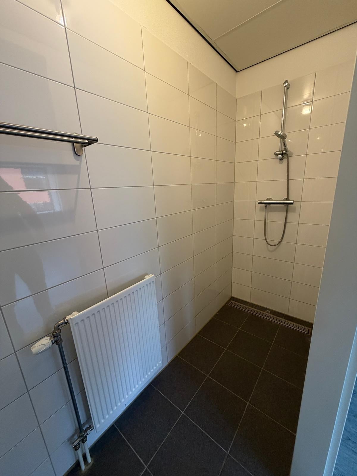 De badkamer is volledig betegeld en uitgevoerd met een douche en wastafelmeubel en apart toilet.
