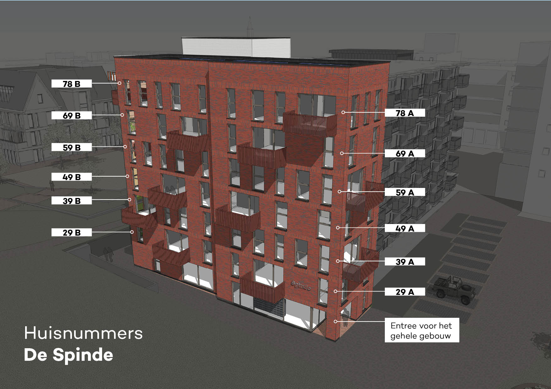 Wij beginnen bij de eerste kandidaat en bellen vervolgens de kandidaten op volgorde totdat alle woningen zijn toegewezen. Tijdens het telefoongesprek maakt u uw definitieve keuze voor een woning. Zorg er daarom voor dat u goed bereikbaar bent en dat uw telefoonnummer correct in uw inschrijving staat. Voorkeurslijst Vul uw voorkeurslijst ( voorkeurslijst-spinde.pdf ) in en houd deze bij de hand wanneer wij bellen. Zo weet u welke woningen uw voorkeur heeft en kunt u tijdens het gesprek direct uw definitieve keuze maken. Appartementen De 12 appartementen zijn verdeeld over zes woonlagen.