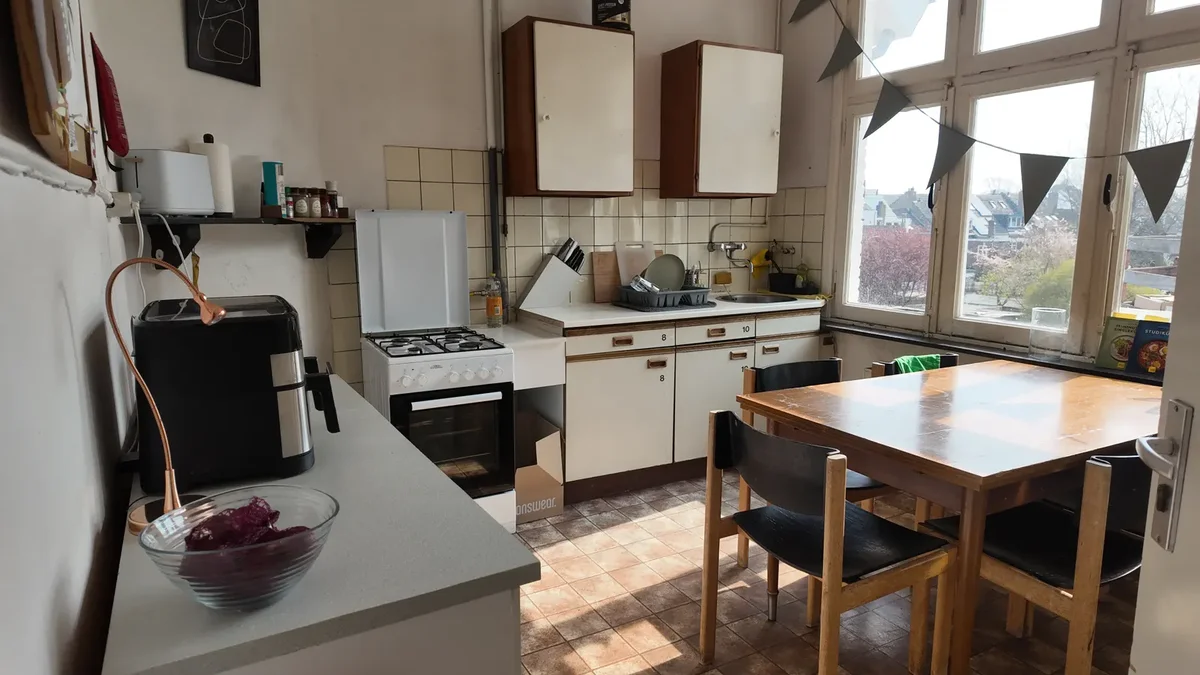 Kamer deelt op tweede etage met 4 andere studenten een keuken, badkamer met douche en WC. Balkon is voor 6 studenten.
