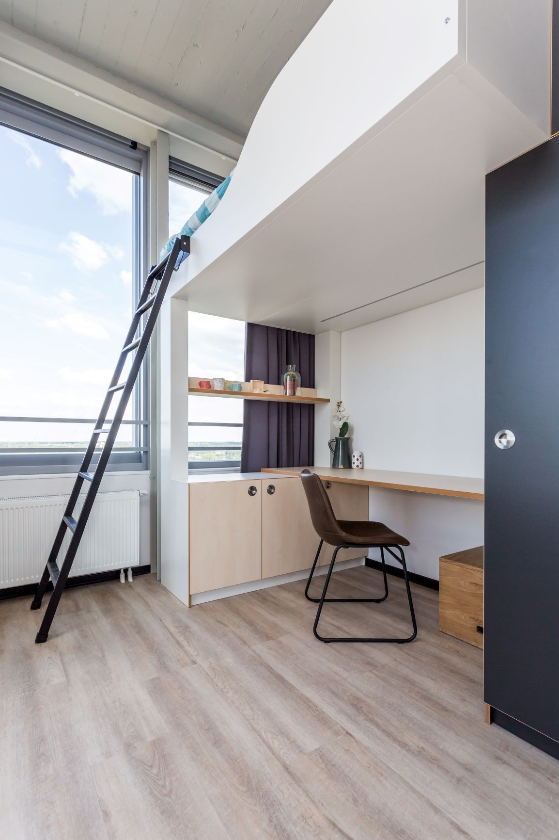 Het complex bevindt zich op de campus van de Technische Universiteit. We verhuren de woning op basis van een campuscontract. Dat betekent dat je in de studio kunt blijven wonen zolang je studeert.De studio heeft een eigen badkamer en keuken. De ruimte is gestoffeerd en gemeubileerd, zodat je er direct in kunt trekken.