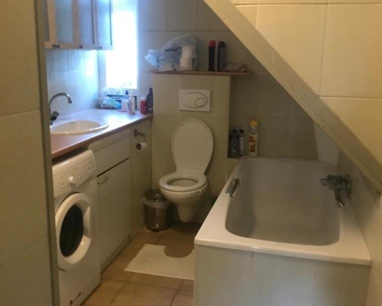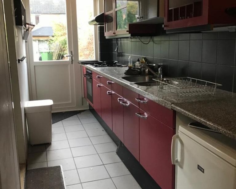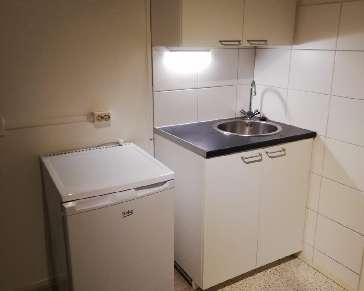 g/w/e. Hierbij komt nog eenmalig €398,- borg. De kamer heeft een eigen gootsteen en koelkast met vriesvak. Er is een wc & badkamer die wordt gedeeld met 5 andere personen en nog een keuken die wordt gedeeld met 3 andere personen.
