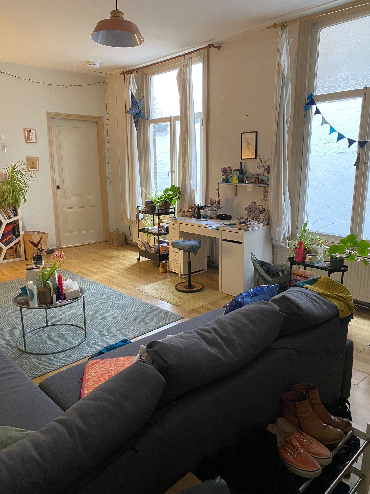 Het huis bestaat uit 3 kamers en 2 (semi-) studio's. In totaal wonen we met z'n vijven. De drie kamers delen een keuken. De badkamer delen we met z'n vieren.