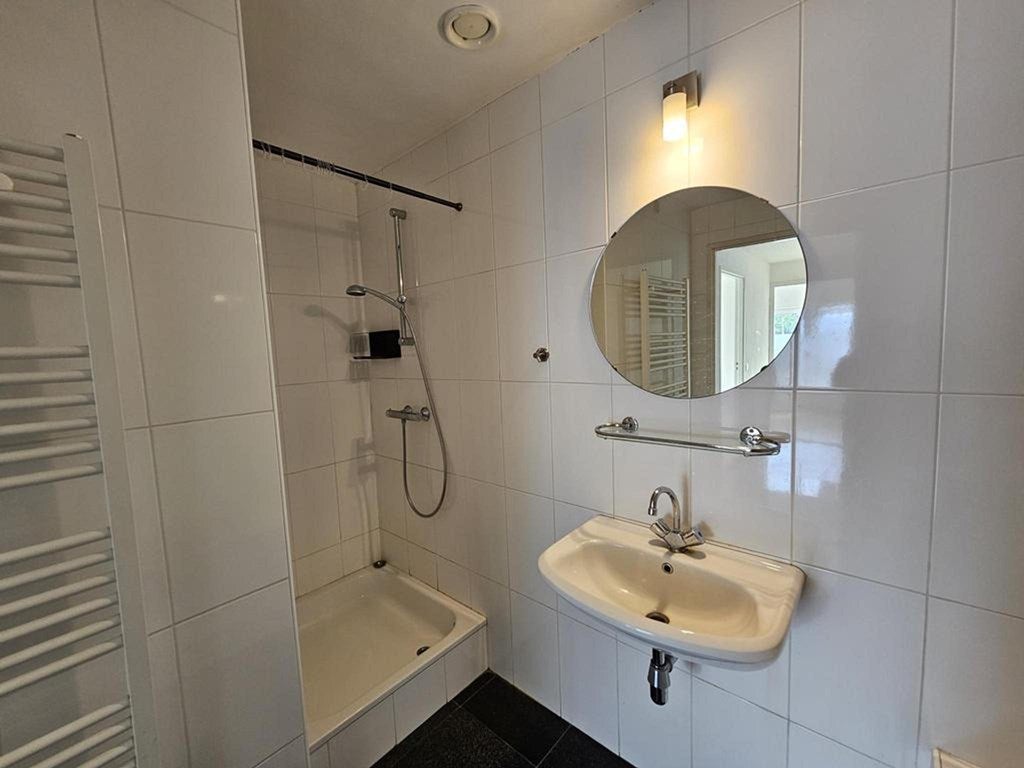 De badkamer is netjes afgewerkt en voorzien van een ligbad met separate douche en handdoek radiator.