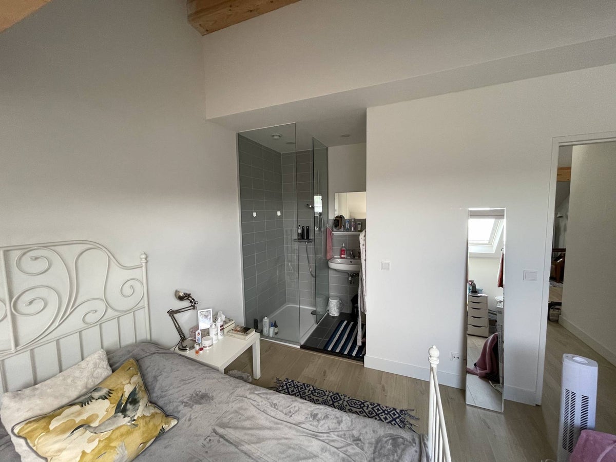 Het toilet is separaat. De open badkamer beschikt over een douche en wastafel met spiegel.