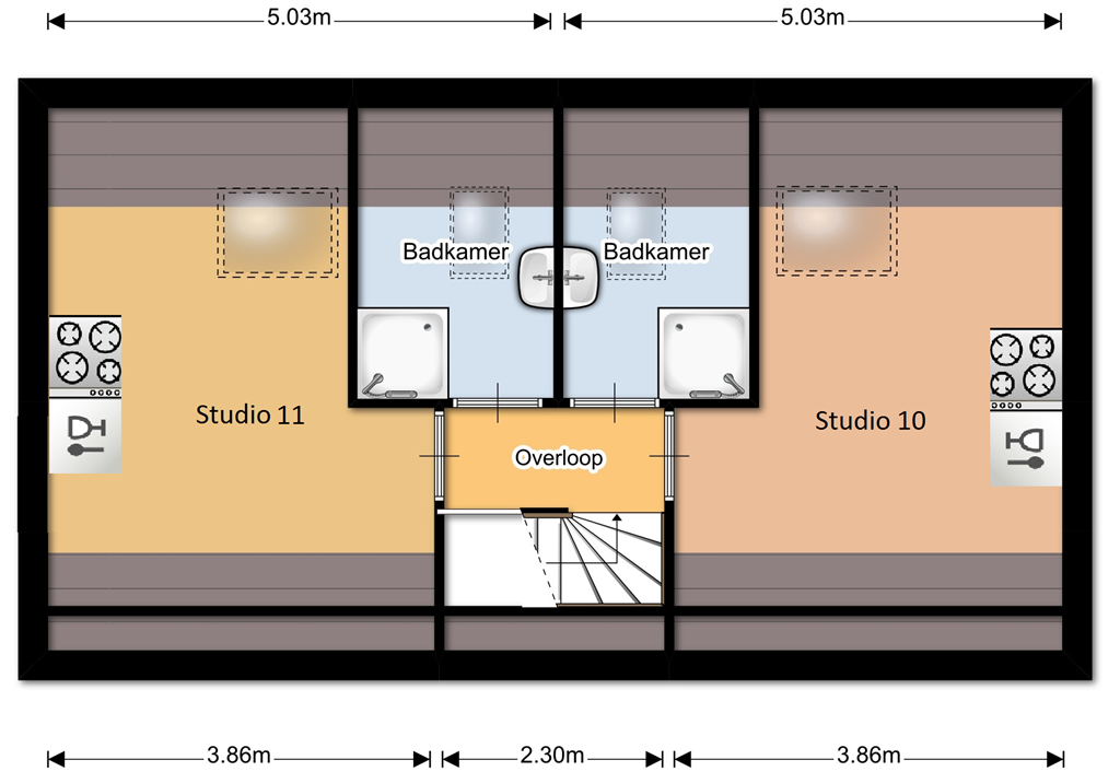 Studio's 1 t/m 9. Overloop met gedeeld gebruik van 2 toiletten en 2 douches. Tweemaal gezamenlijke betegelde wasruimte voorzien van wasmachine en droger.