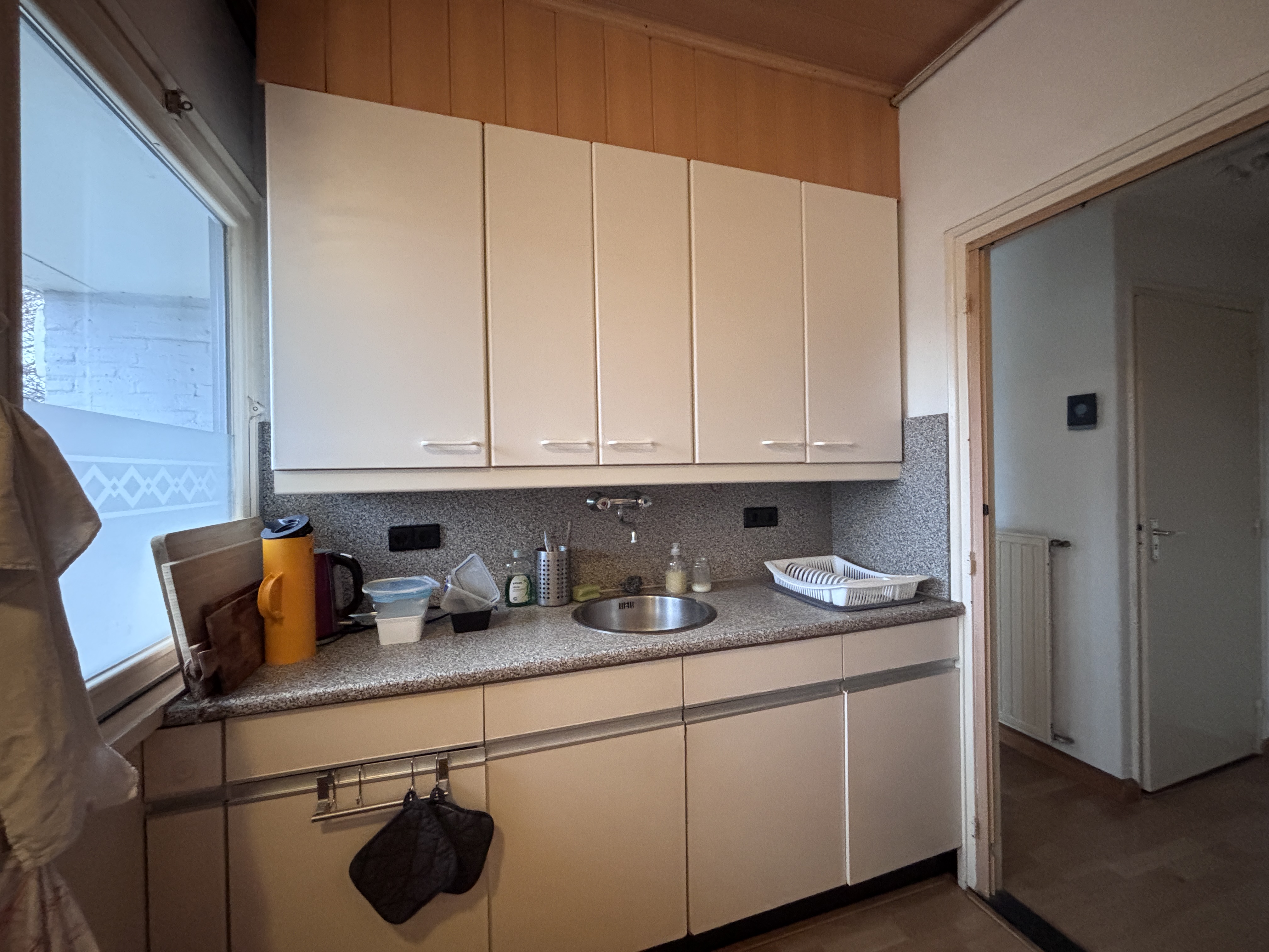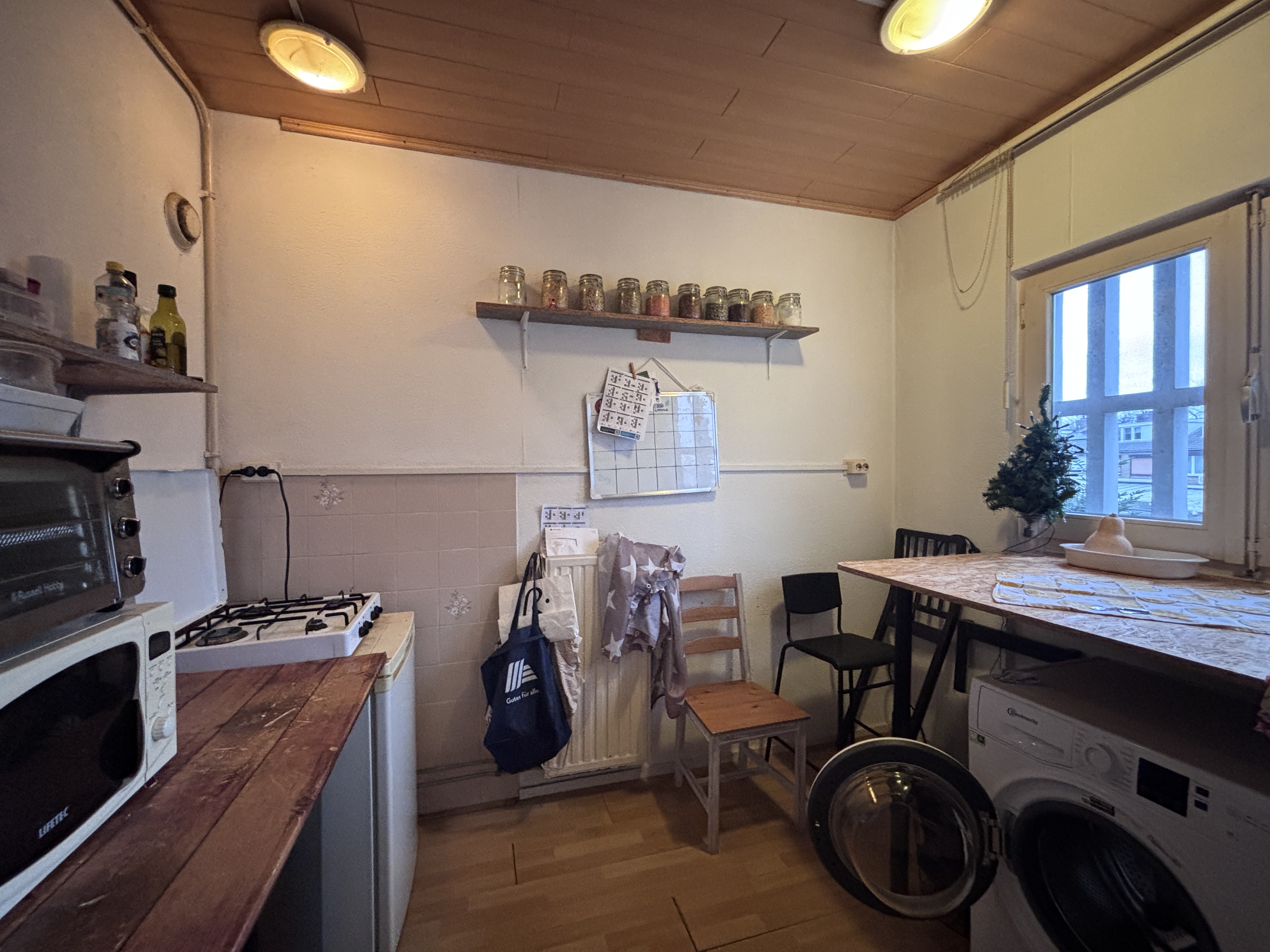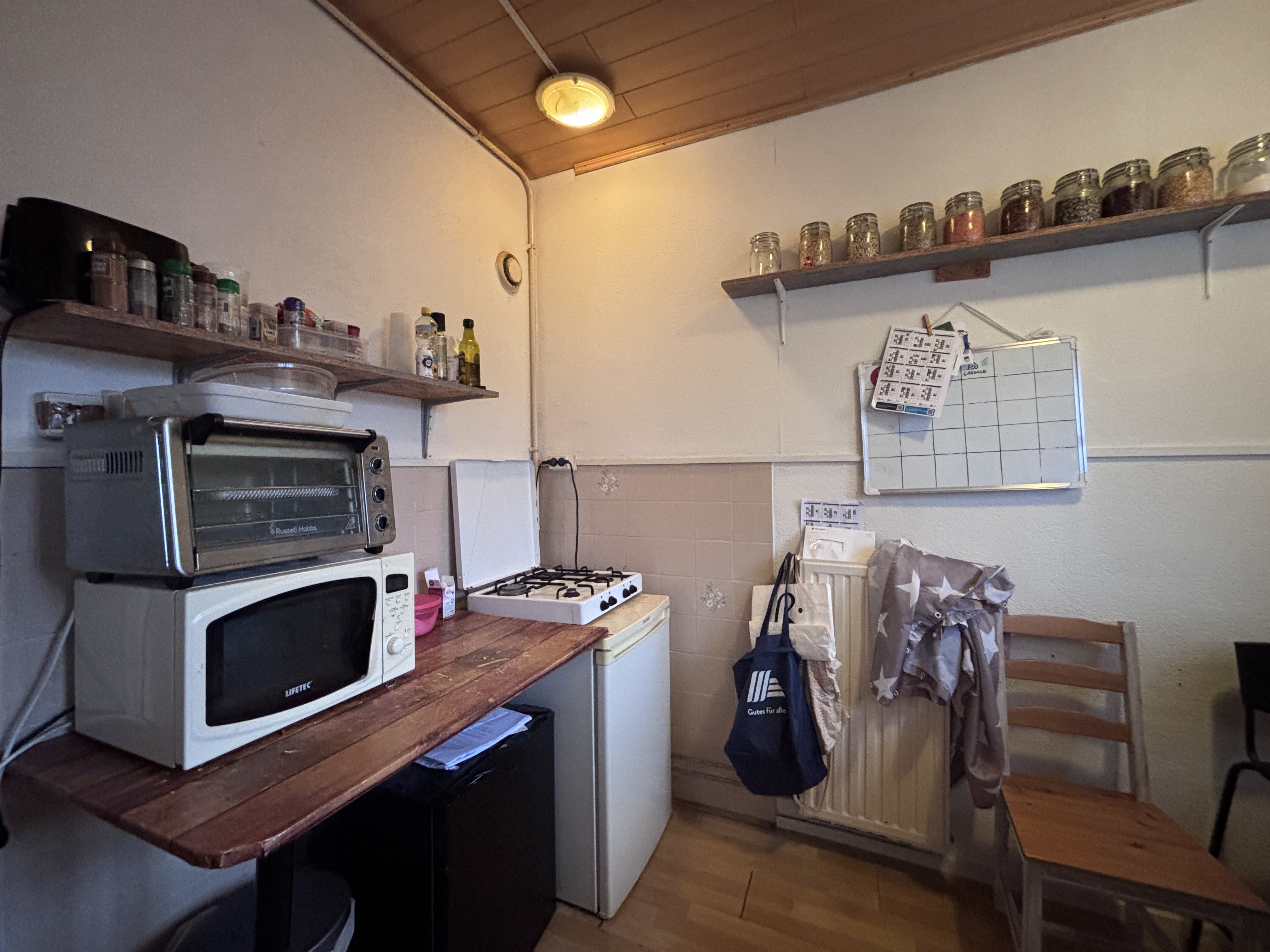 Vanuit de hal is tevens toegang tot de gezamenlijke keuken, die is uitgerust met een 4-pitsgasfornuis, een koelkast, een vriezer, een magnetron en een oven. Tevens staat de gedeelde wasmachine in de keuken. Eén van de vier kamers liggen op de begane grond.
