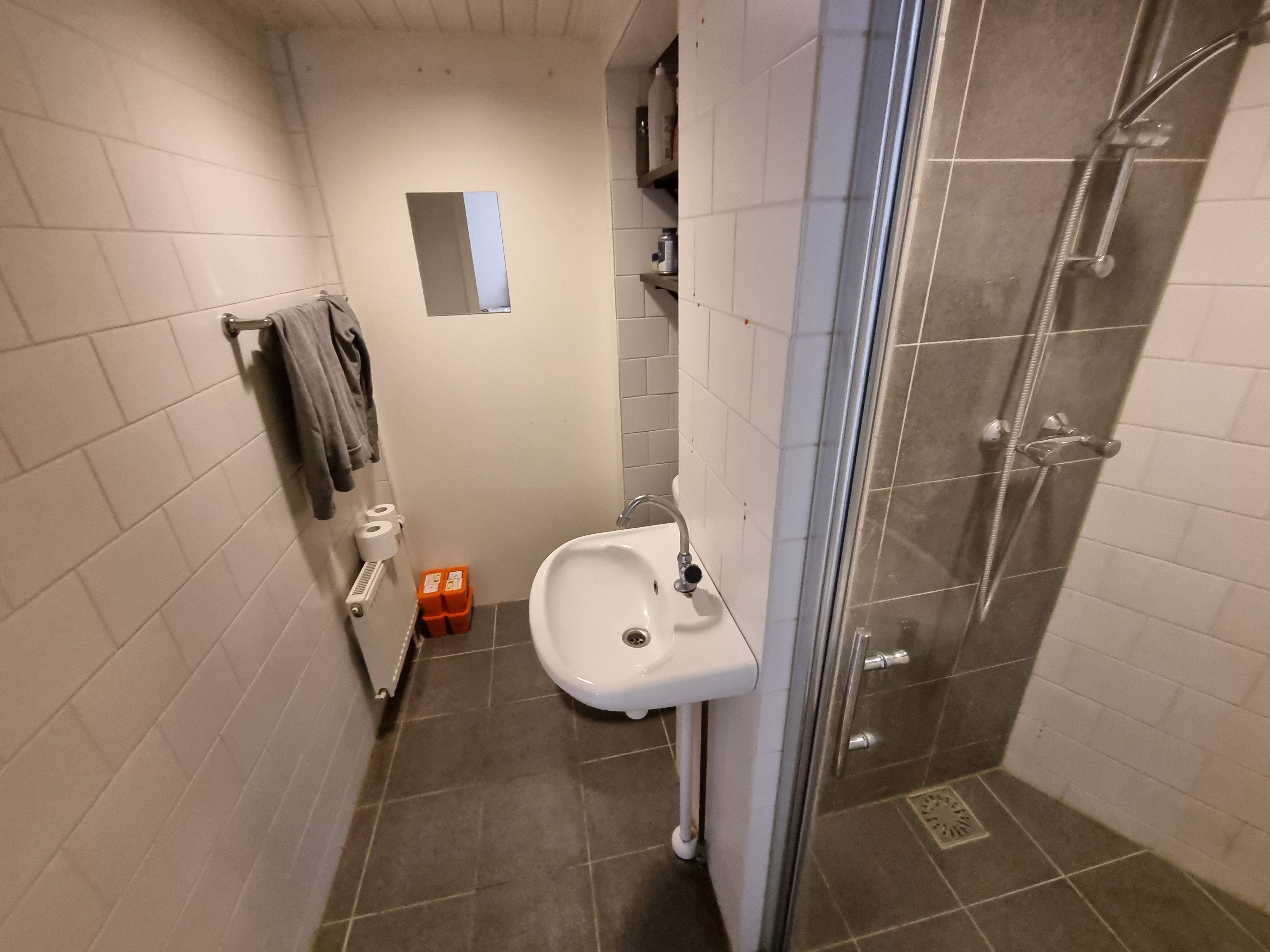 De woonkamer met open keuken is circa 10 m². De keuken is voorzien van een ingebouwde afzuigkap. Tot slot is er een badkamer van circa 4 m², voorzien van een inloopdouche, toilet en wastafel.