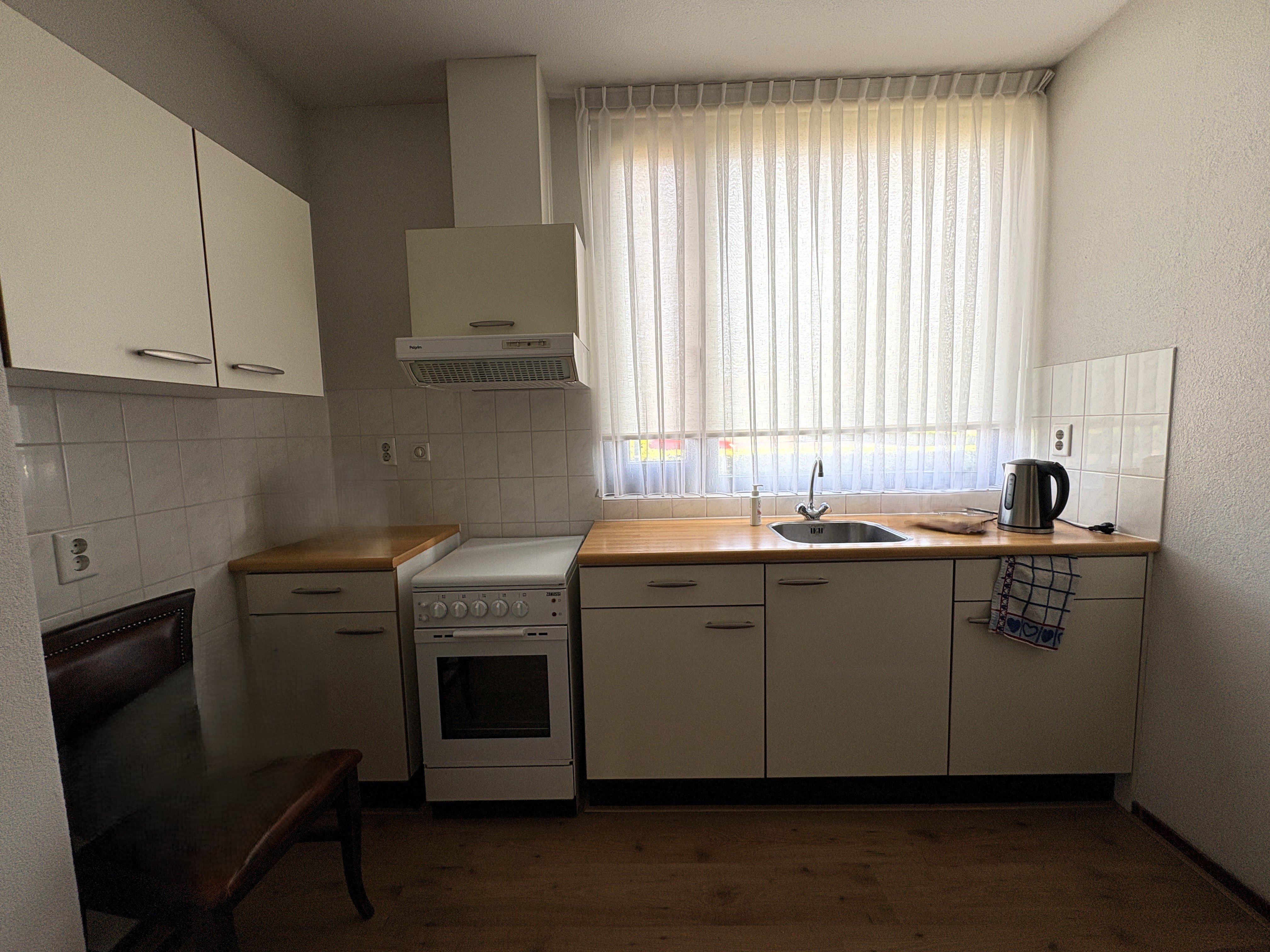 Appartement op de begane grond met twee slaapkamers en open keuken.
