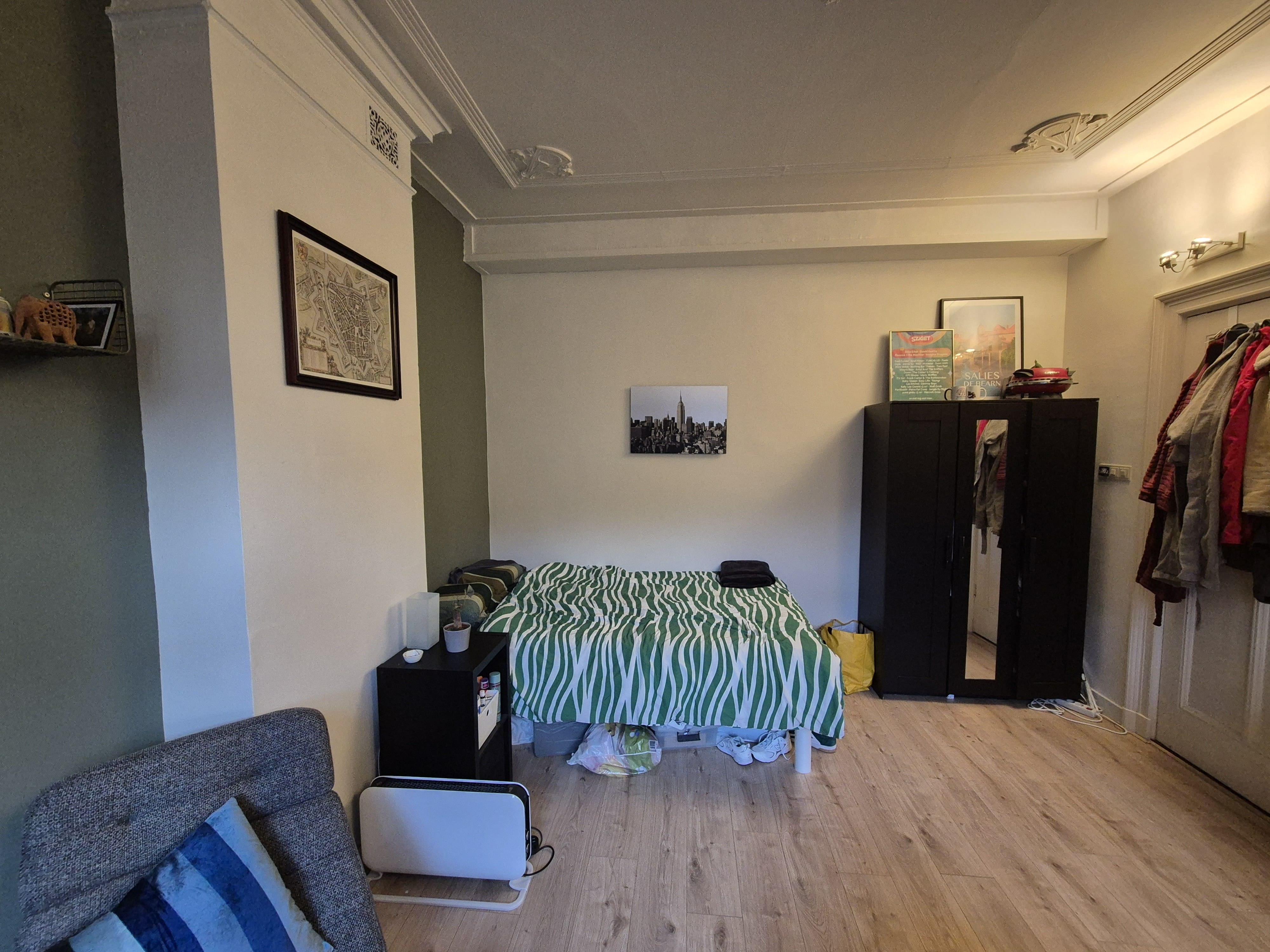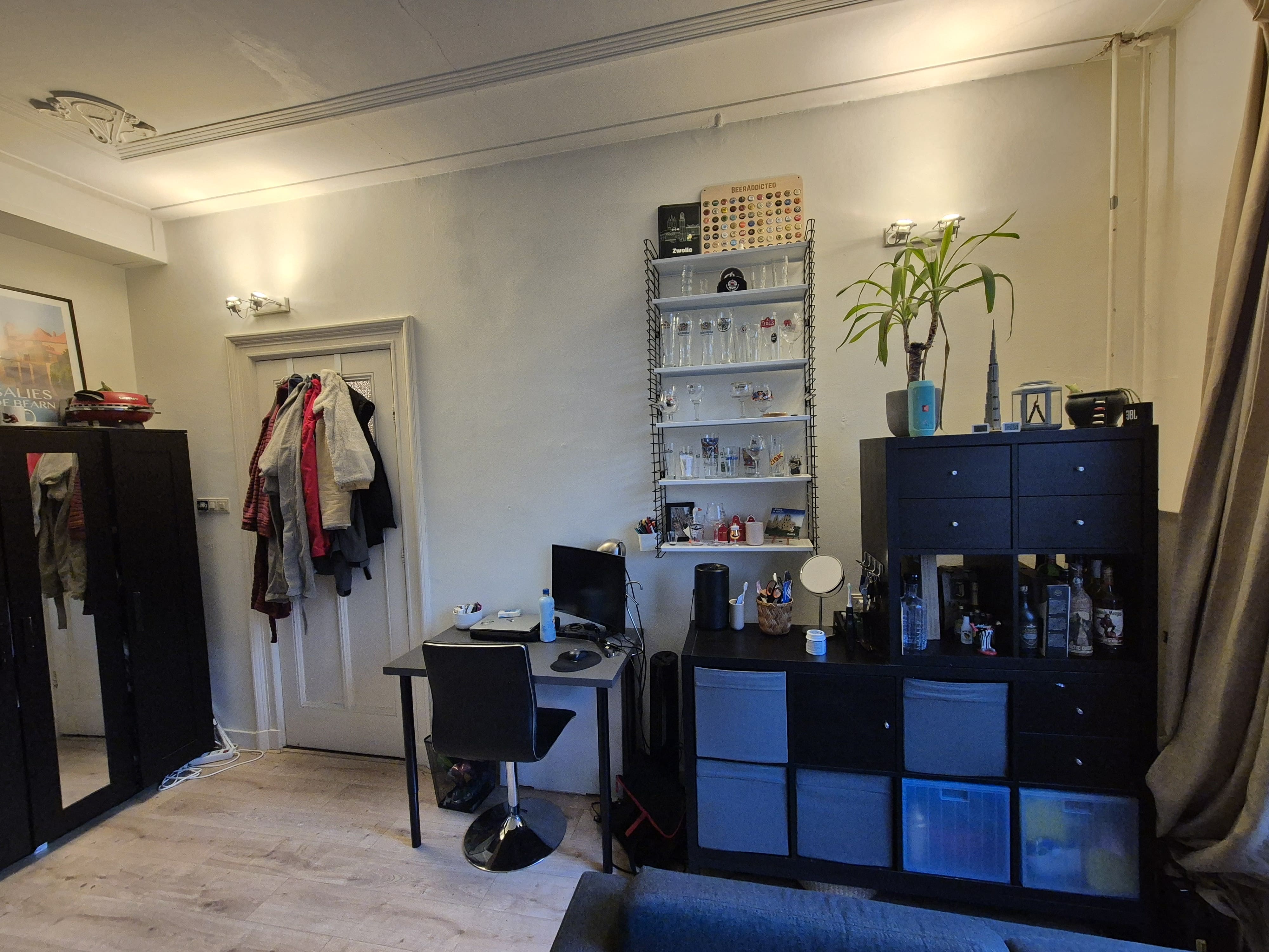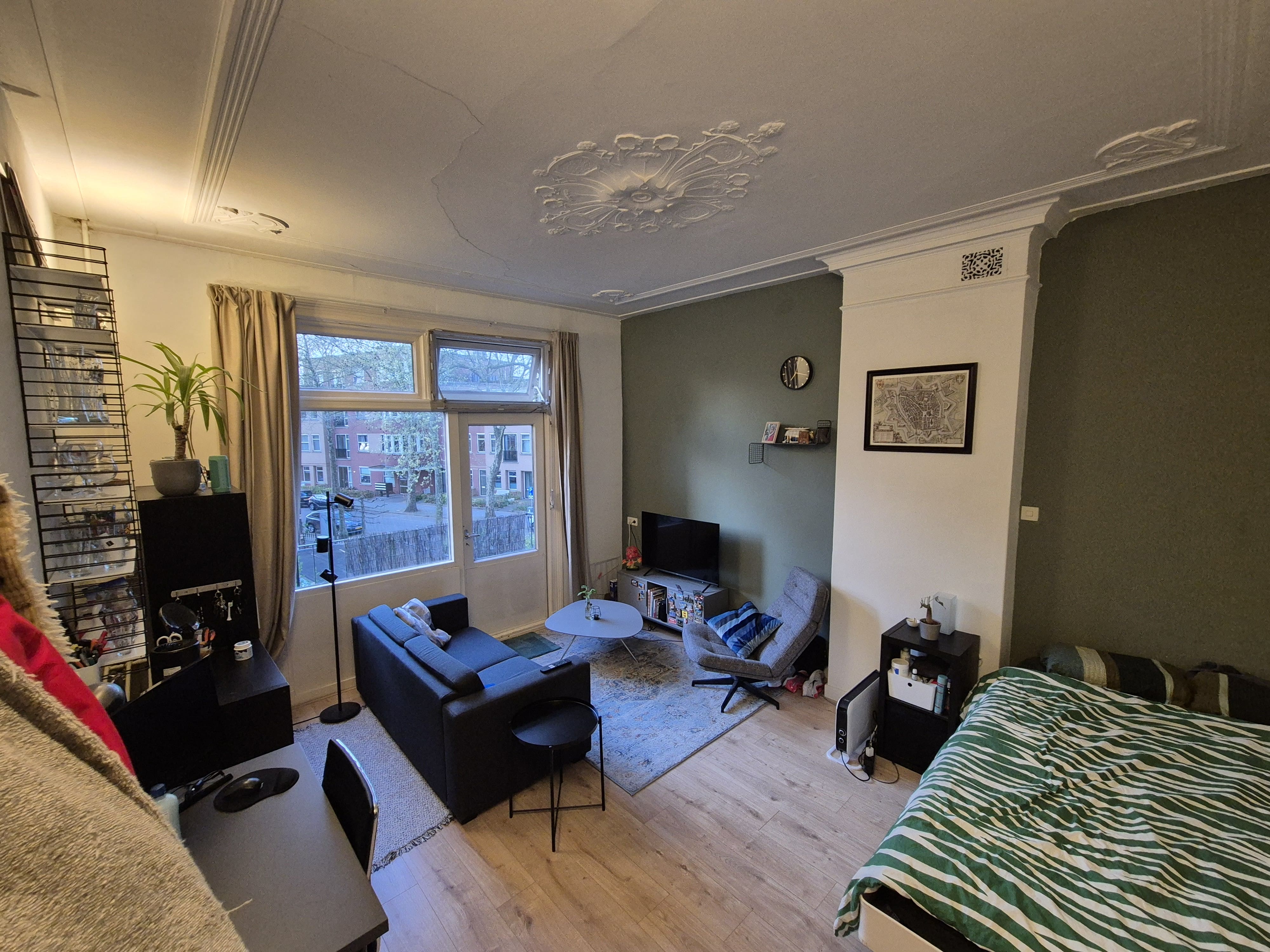 De kamer is 24m2 met een plafondhoogte van 3,15m en is door de grote ramen erg licht. Het huis beschikt over een ruime woonkamer, eetkamer, moderne keuken en badkamer.