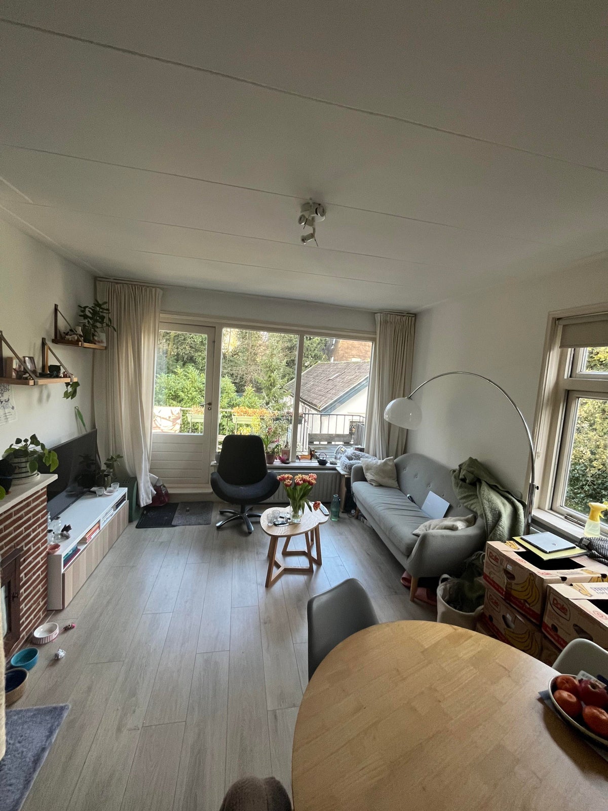 Indeling: woonkamer met open keuken, trap naar slaap vide en een badkamer met toilet.