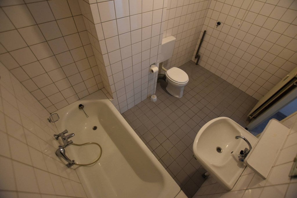 Geheel betegelde badkamer voorzien van douche, wastafel en toilet.