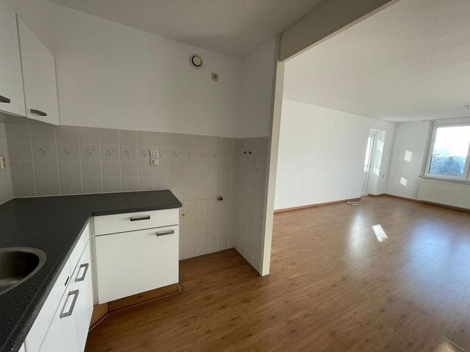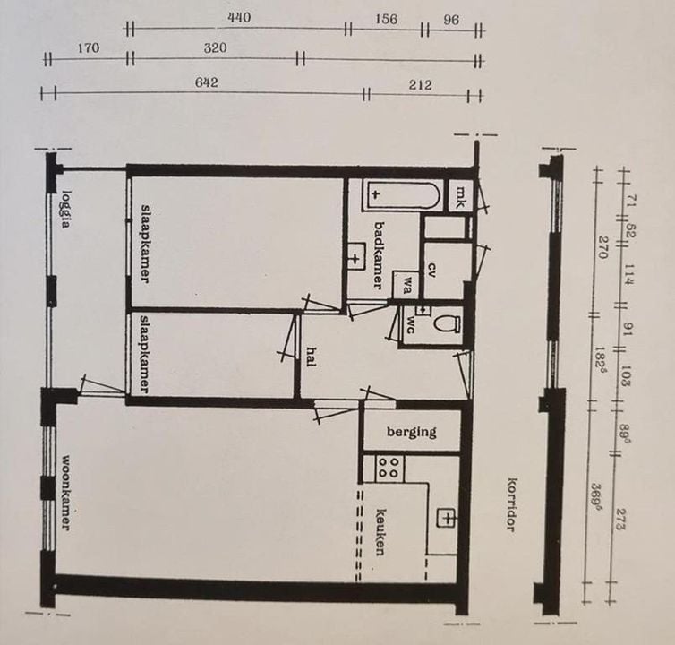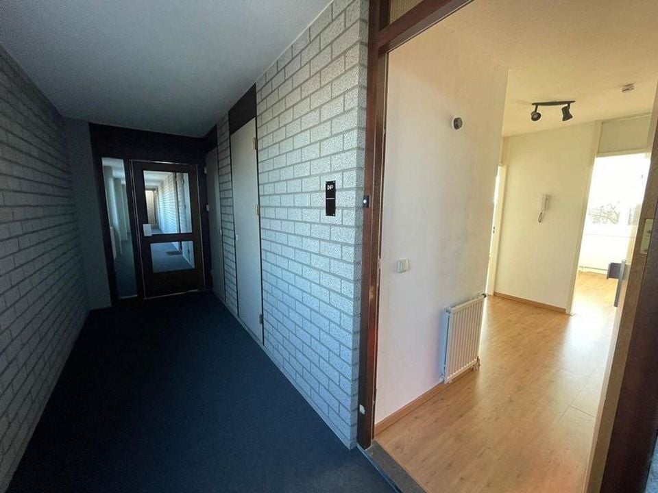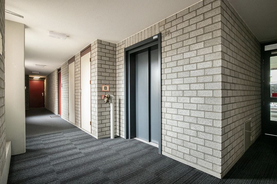 Appartement met lift, woonkamer, open keuken, berging, 2 slaapkamers, loggia, badkamer, toilet en cv-ruimte.