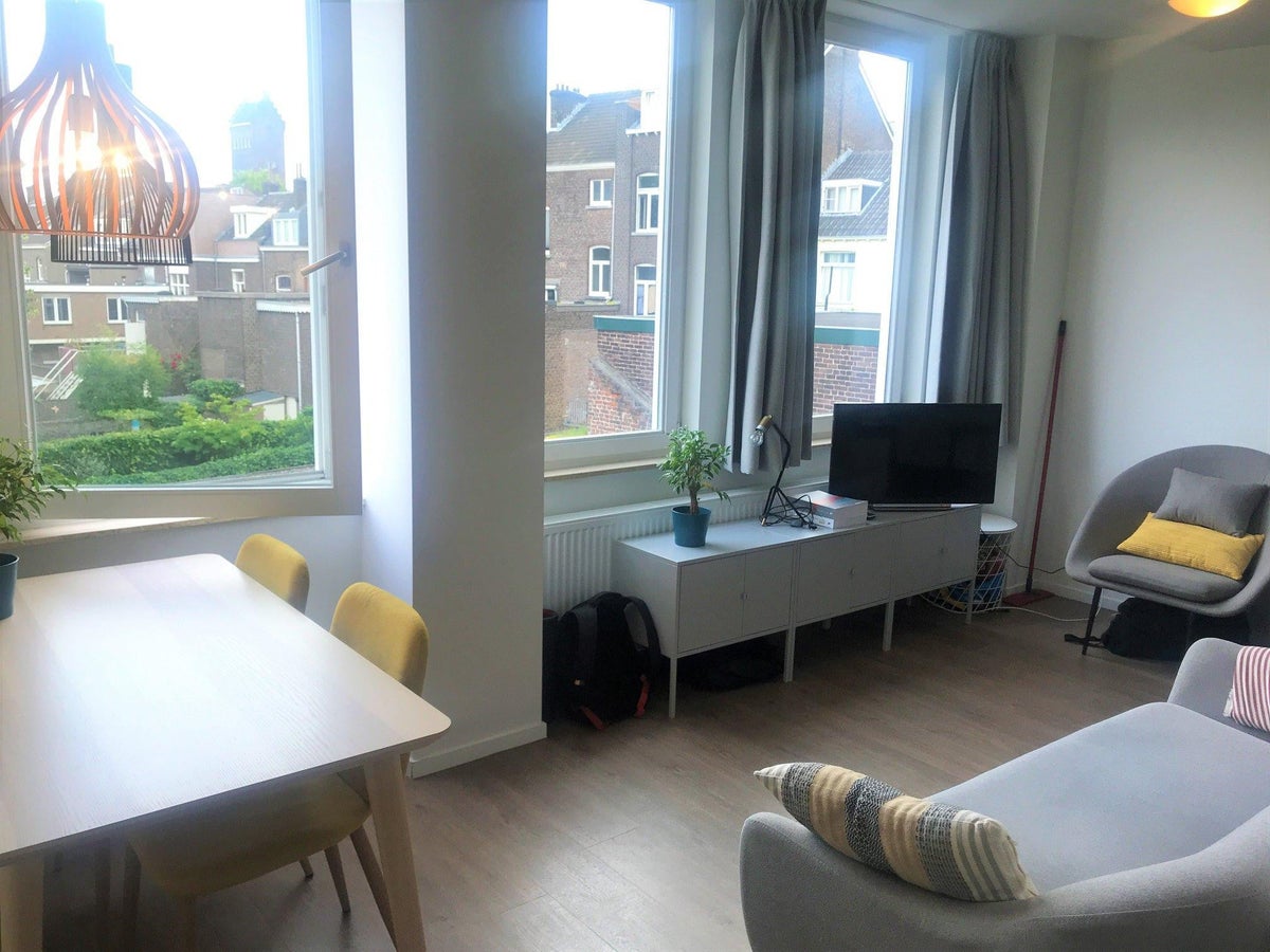 De studio is gelegen op korte loopafstand van het treinstation Maastricht. De moderne badkamer beschikt over een regendouche.De open keuken is uitgerust met een koelkast met vriesvak, vaatwasser, oven, elektrische kookplaten en afzuiging.De studio bevindt zich op de tweede verdie....