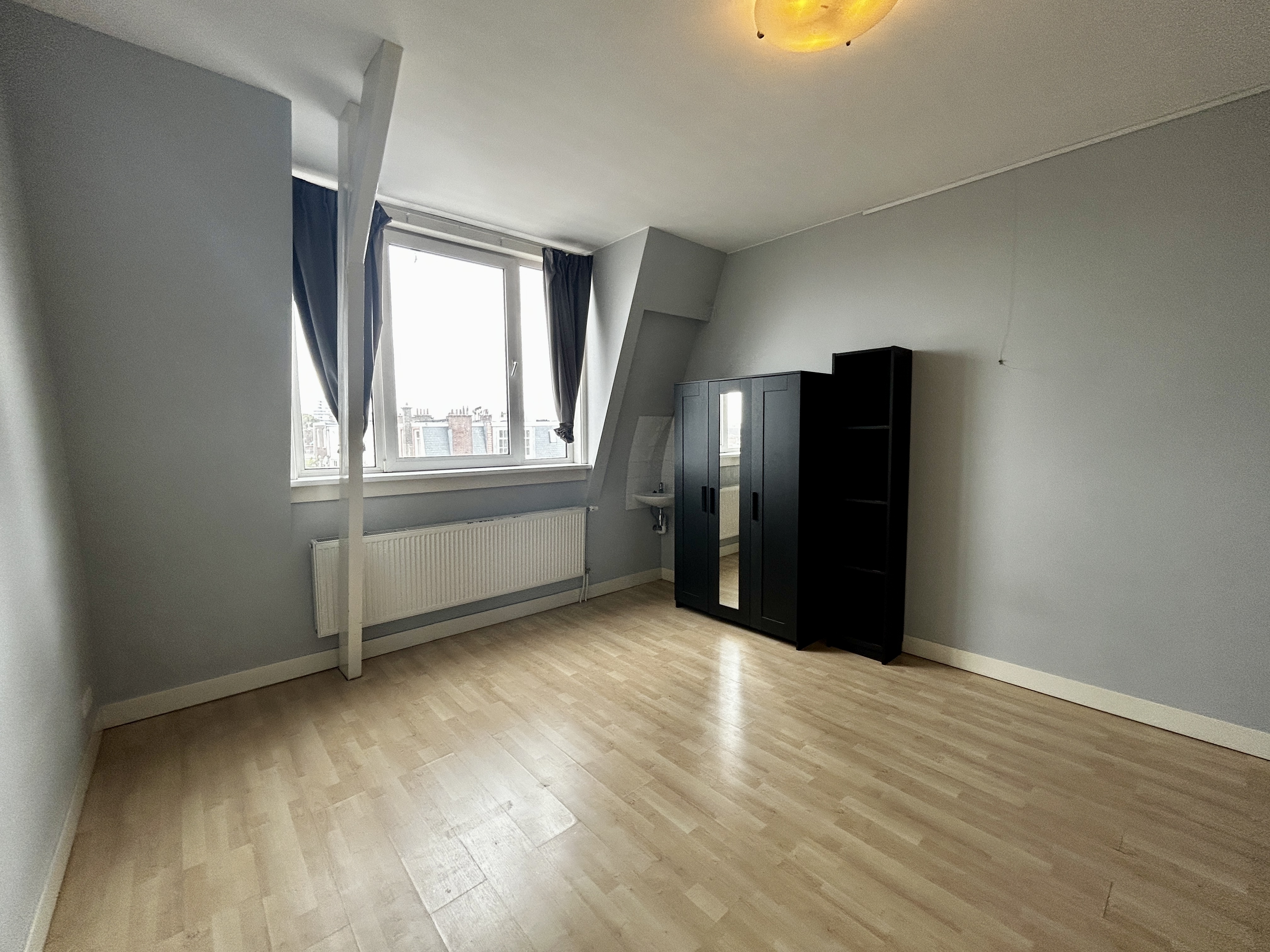 Deze lichte kamer van 18m² bevindt zich op de 3e verdieping van een statig dubbel herenhuis met indrukwekkende 3 meter hoge plafonds.De kamer is volledig gerenoveerd en voorzien van een eigen keuken met inductiekookplaat, afzuigkap en koelkast. De laminaatvloer en verduisterende gordijnen blijven aanwezig, verder wordt de kamer leeg en bezemschoon opgeleverd. Er is een Ziggo TV-aansluiting en de mogelijkheid voor een eigen vaste internetaansluiting. Schoonmaakservice voor de gemeenschappelijke ruimtes (toilet en douche) is inbegrepen.Huur: €599 per maand, volledig inclusief g/w/e.