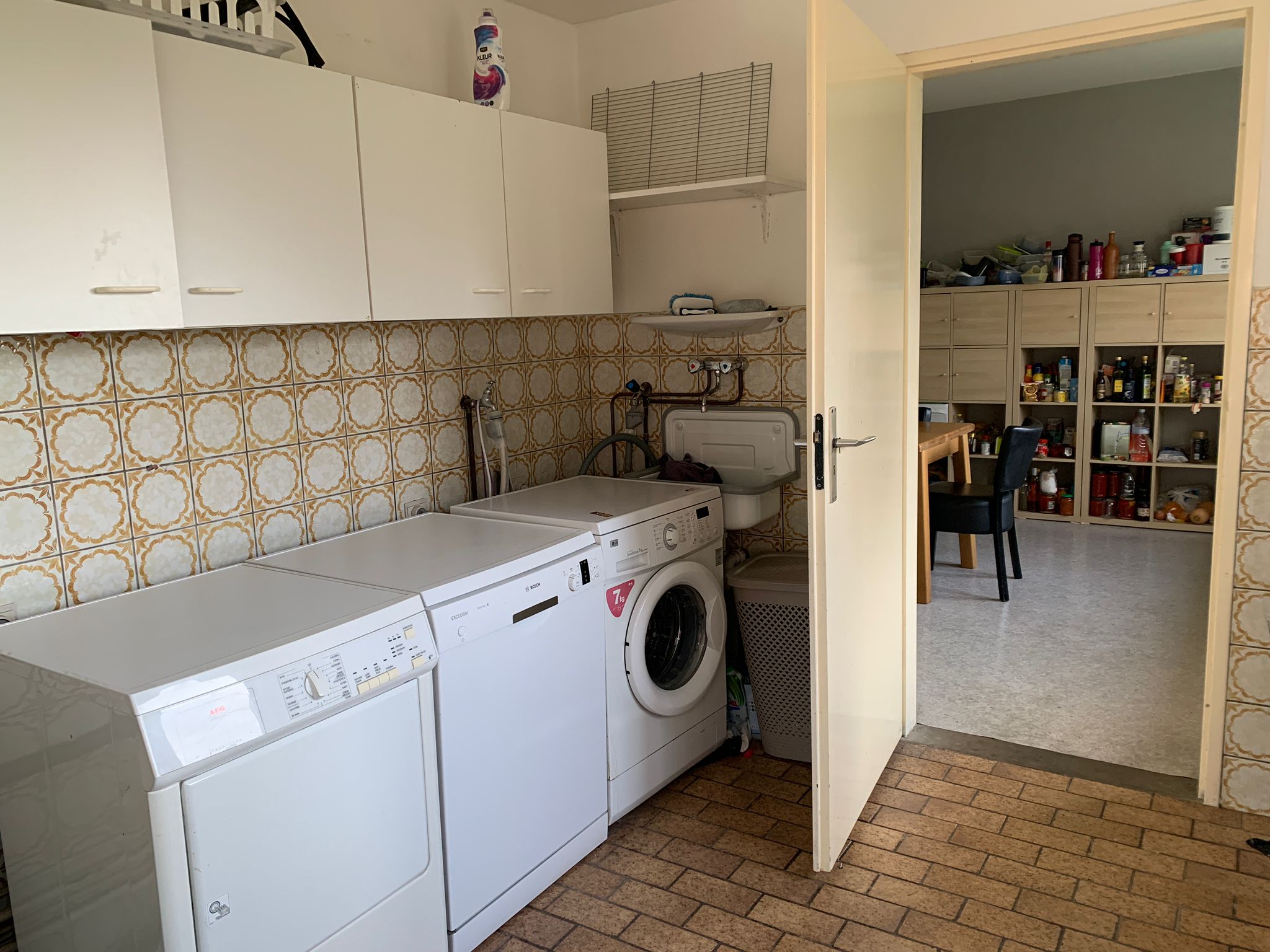 Het huis heeft een bijkeuken met wasmachine, droger, vaatwasser, koelkast met vriezer en opbergkast.
