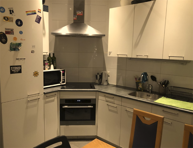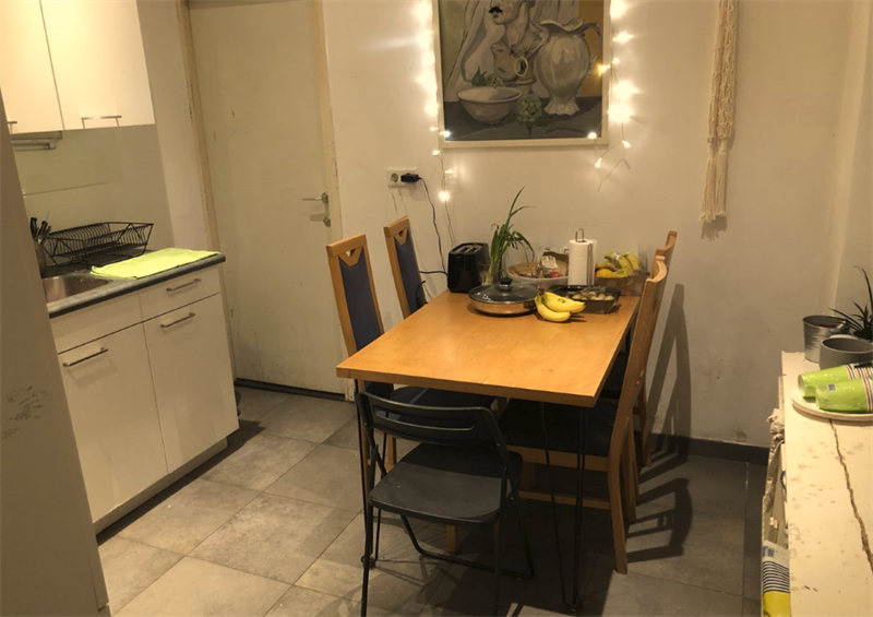 Deze kamer geeft middels openslaande deuren direct toegang tot de binnenplaats. De gemeenschappelijke faciliteiten, bestaande uit 1 keuken, 1 kitchenette, 2 badkamers en 2 toiletten worden gedeeld door 6 huurders. Achter het huis is een binnenplaats waar fietsen gestald kunnen worden. Huurprijs € 495,00/maand is excl.