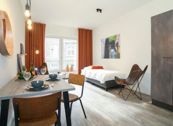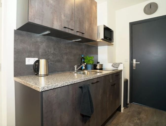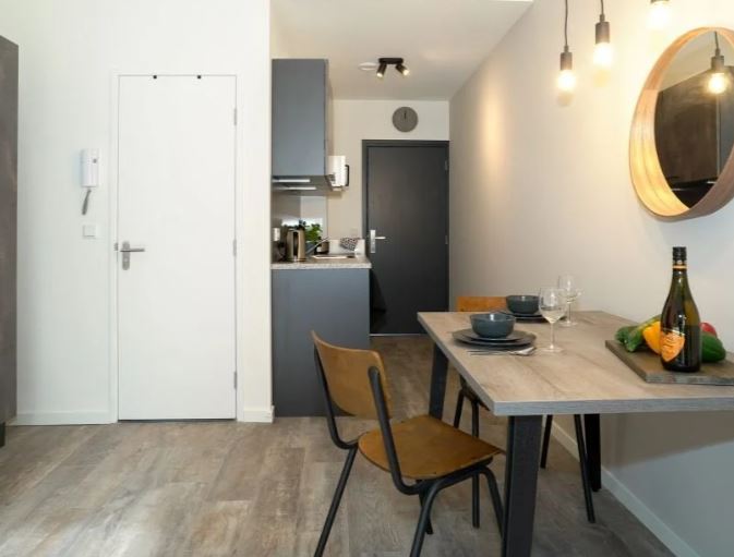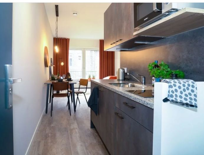 de Universiteit en Hogeschool, de winkels, uitgaansgelegenheden en het centraal station. De studio's zijn ontworpen in industriële stijl en uitgerust met een eenpersoons bed, moderne badkamer, luxe open keuken (incl. inbouwapparatuur), royale kleding-/opbergkast, tafel met stoelen, lounge stoel, high-speed internet, afsluitbare privé berging op de gang en privé brievenbus. Gezamenlijk gebruik van de wasmachines, wasdrogers, strijkijzers, strijkplanken en stofzuigers in het souterrain.