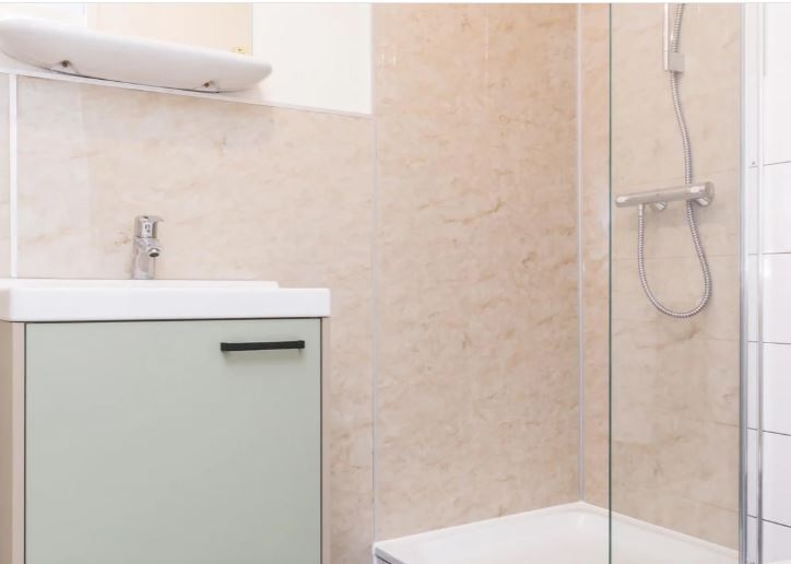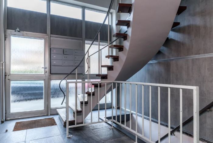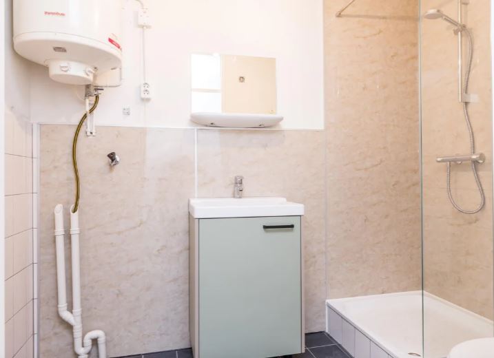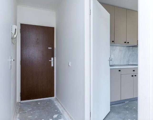 Indeling Begane grond Gezamenlijke entree met brievenbussen en intercominstallatie Separate berging Entree - hal Woonkamer met open keuken - (4,34 x 6,60, 0,97 x 0,94) Slaapkamer - (4,14 x 2,55) Betegelde badkamer met douche, toilet, vaste wastafel en wasmachine aansluiting - (2,61 x 1,59) Inpandige berging (2,97 x 3,36) Isolatie : v. v.