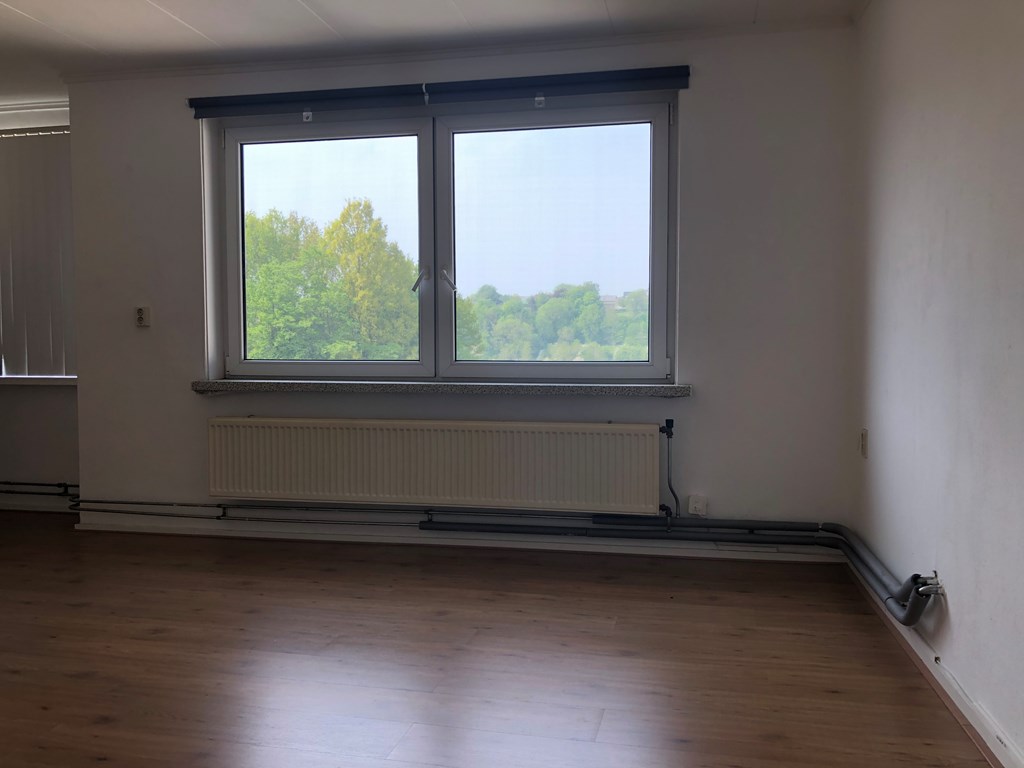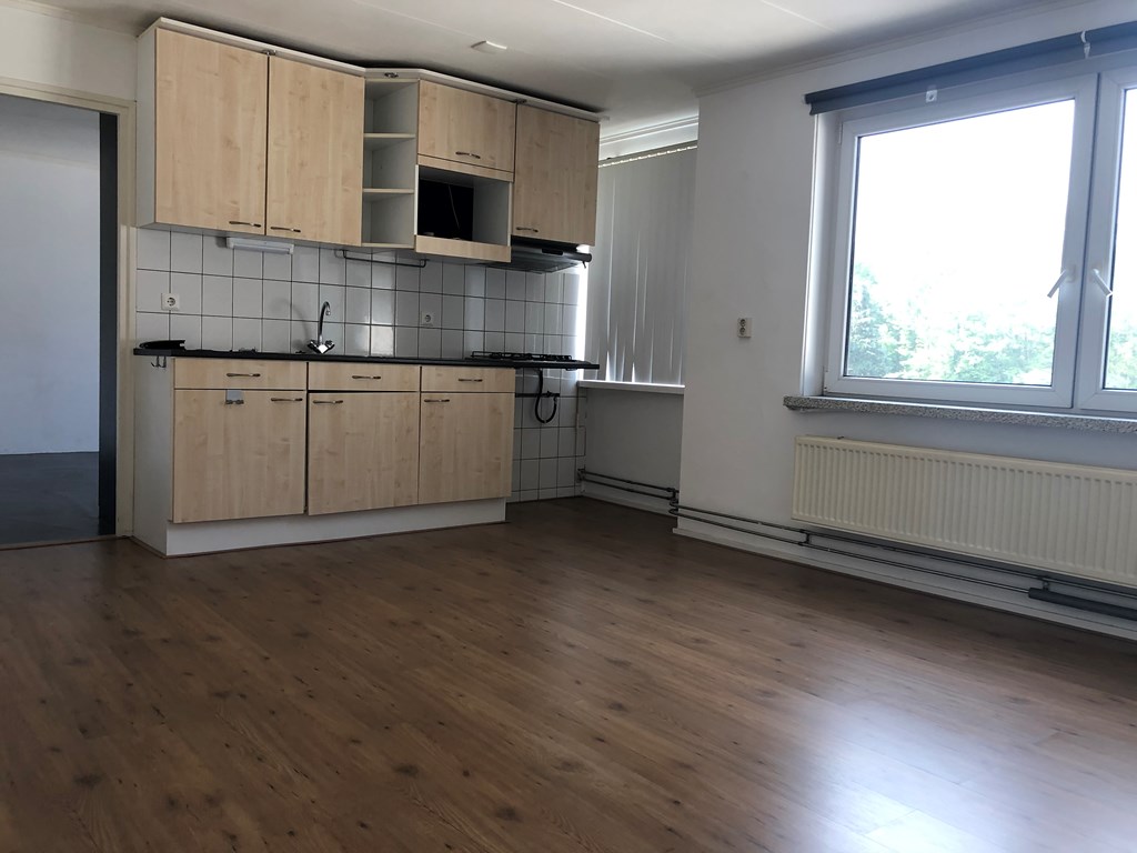 Het appartement is gelegen op de eerste verdieping. De woonkamer met open keuken geniet veel lichtinval en biedt een schitterend uitzicht op het Limburgse heuvelland. De keuken is v.v. een eenvoudig keukenblok met afzuigkap en 4 pits gasfornuis.