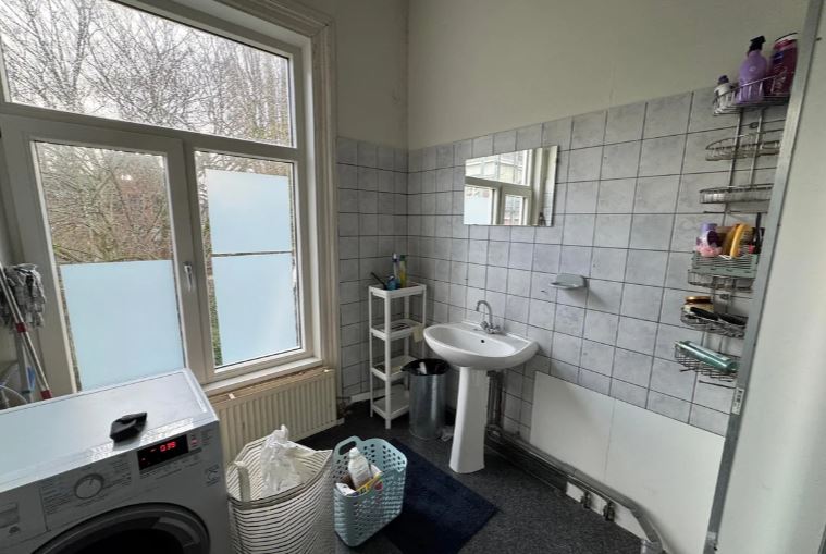 De zeer ruimte badkamer met nieuwe douchecabine, wastafel en wasmachine, wordt gedeeld met vijf andere bewoners. Het toilet slechts met twee personen. Bij interesse graag een bericht sturen en daarin aangeven wat je leeftijd is en welke studie je doet..