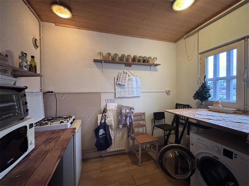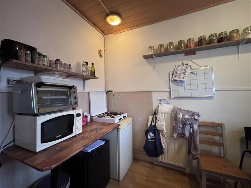 Hier zijn ook alle fietsenbergingen te vinden, waaronder de fietsenberging behorende tot het appartement. Deze kan worden afgesloten.Begane grond appartement: Bij binnenkomst via de gezamenlijke entree kom je in de hal, waar zich een apart toilet bevindt. Vanuit de hal is tevens toegang tot de gezamenlijke keuken, die is uitgerust met een 4-pitsgasfornuis, een koelkast, een vriezer, een magnetron en een oven. Tevens staat de gedeelde wasmachine in de keuken.