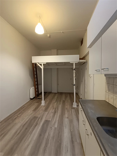 De woonkamer met open keuken is circa 17m2 groot en heeft veel lichtinval via de grote koepelramen op het dak. Er is een slaapvide aanwezig in de woonkamer voor een effectieve indeling van de ruimte. Ook is er een badkamer aanwezig voor eigen gebruik, met douchecabine en toilet. Bij de entree is een gemeenschappelijke fietsenberging.