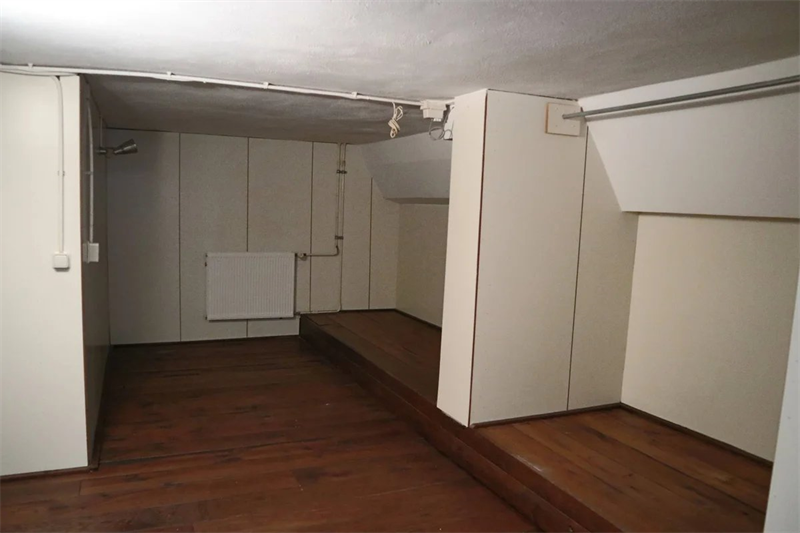 Trap naar het souterrain waar de ruime slaapkamer zich bevindt. De huurprijs is €878 exclusief voorschot gas van €60 per maand en exclusief water en elektra..