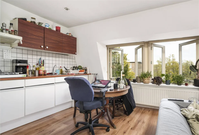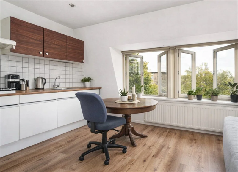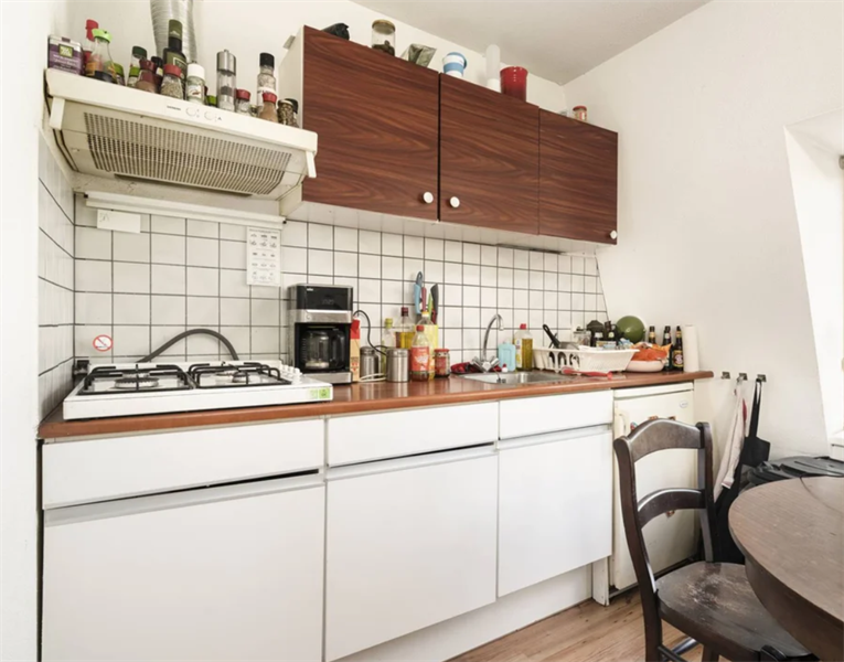 De diverse raampartijen in deze ruimte voorzien de woning van een aangename hoeveelheid licht. Aan de linkerzijde van de woonkamer bevindt zich de keuken. Zoals op de foto's te zien is, is de keuken voorzien van ruim voldoende kastruimte. De kookplaat en de afzuiger zijn bij de woning inbegrepen.