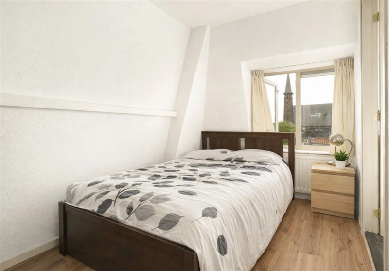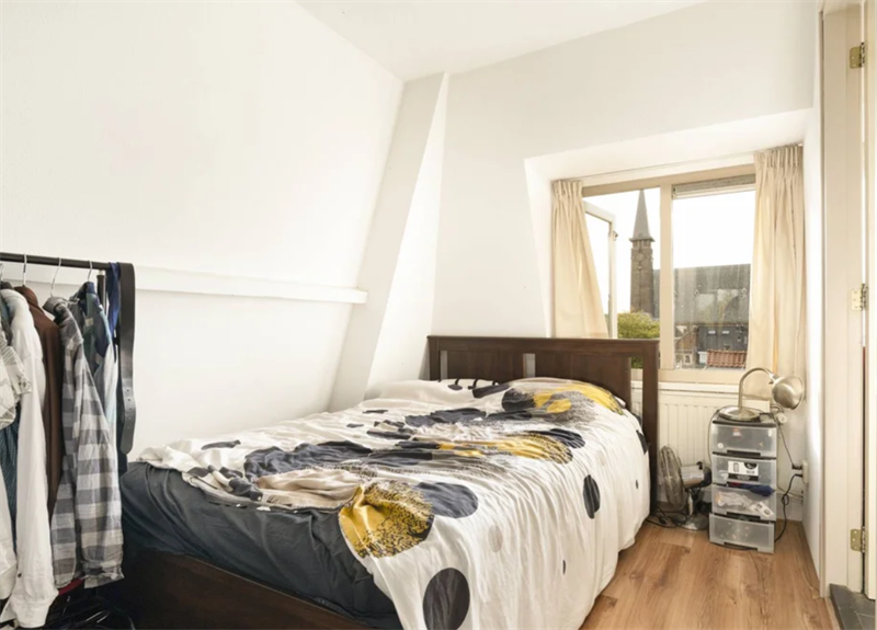 De slaapkamer bevindt zich aan de andere zijde van de woning. Ook deze ruimte is voorzien van een raampartij die te openen is. De badkamer is te bereiken via de slaapkamer. De badkamer is voorzien van een inloopdouche en een wastafel.