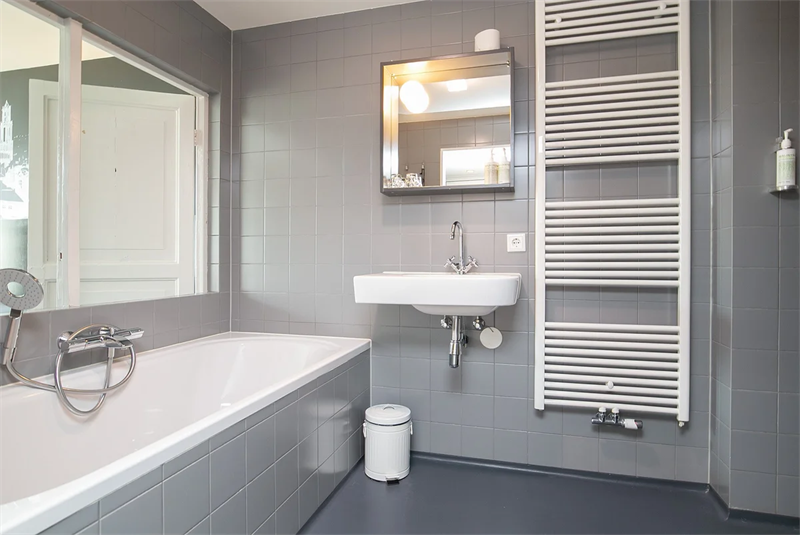 De badkamer is voorzien van bad, separate douche, zwevend toilet en wastafel met meubel..