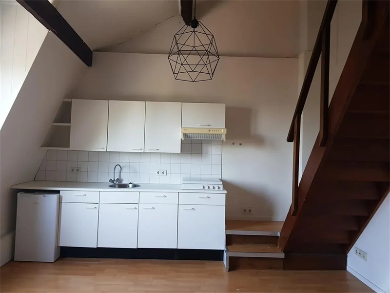 Het appartement bestaat uit een halletje met toegang naar de woonkamer met open keuken (inclusief kookplaat en ijskast) met open vide, slaapkamer aan de achterzijde en een badkamer met douche, wastafel en toilet. Geschikt voor een koppel.