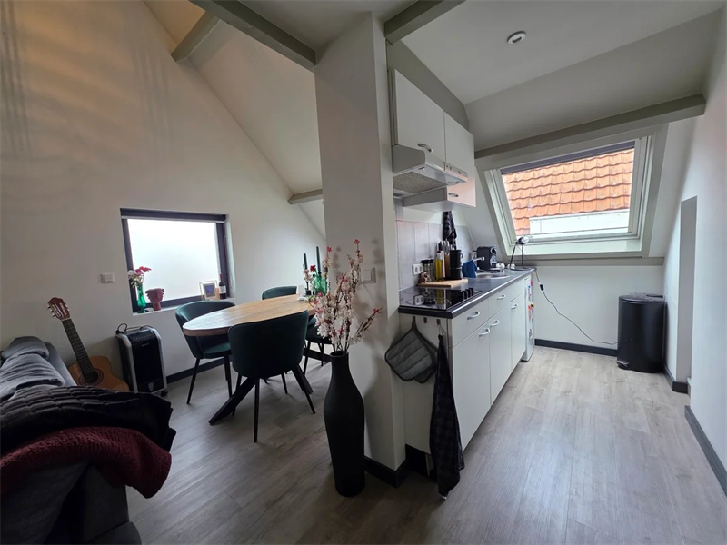 Deze semi-zelfstandige studio bevindt zich op de 2e verdieping, in een kleinschalig complex (4 woningen in totaal). Bij binnenkomst tref je de woonkamer met links de halfopen keuken. De keuken is voorzien van een kookplaat, koeler (zonder vriesvak) en wasemkap.Daarnaast biedt de keuken voldoende opbergruimte. De woonkamer is enorm sfeervol en boven de woonkamer heb je een vide waar zich een apart slaapgedeelte bevindt.