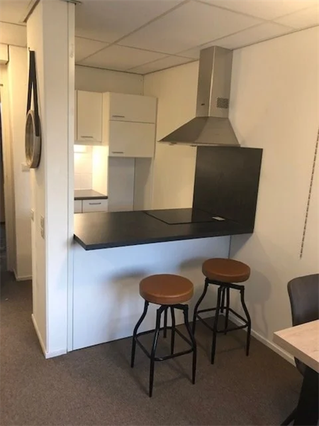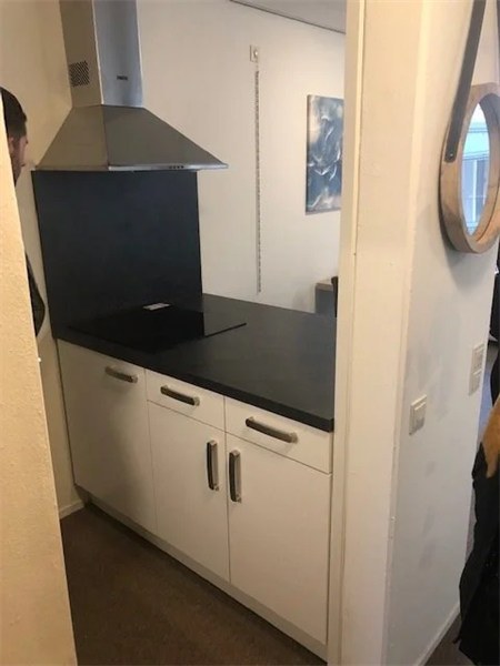 Deze studio is praktisch ingedeeld en van alle gemakken voorzien. Je beschikt over een eigen entree, een nette badkamer met douche en toilet, en een keuken met kookeiland, inductiekookplaat, afzuigkap en koelkast. Daarmee biedt deze woonruimte alles wat je nodig hebt voor comfortabel en zelfstandig wonen. Op iedere verdieping bevindt zich een gezamenlijke wasruimte met drie wasmachines en drie drogers.