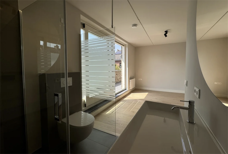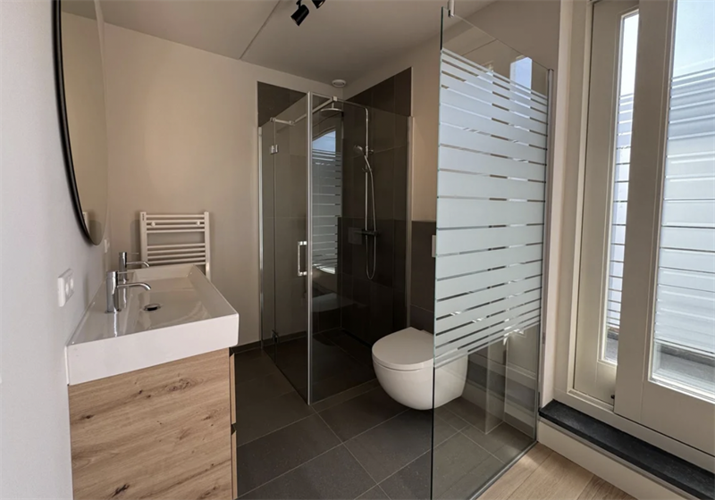 Eerste verdieping: Deze verdieping beschikt over een ruim woon- en slaapgedeelte. Het woongedeelte beschikt over een hoogwaardig afgewerkte keuken en is voorzien van alle benodigde inbouwapparatuur waaronder 4-pits inductiekookplaat, koelkast met vriesvak en combi-oven. Aan de achterzijde van het pand is de slaapkamer gelegen en grenst aan de moderne badkamer en suite. De badkamer is voorzien van een dubbele wastafel, inloopdouche en toilet.