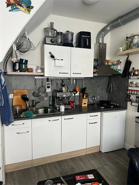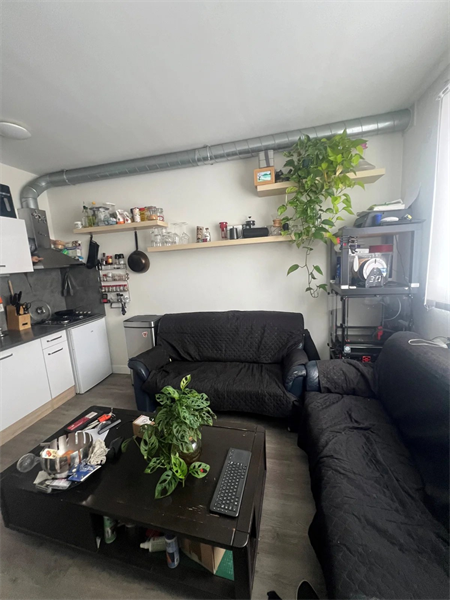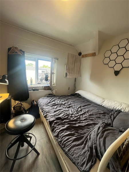 Op de 1e verdieping vind je een lichte woonkamer met een open keuken. De trap leidt naar de slaapverdieping, waar voldoende ruimte is voor een bed, kast en eventueel een bureau. De badkamer bevindt zich ook op deze verdieping. Het toilet wordt gedeeld met medebewoners.
