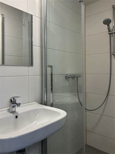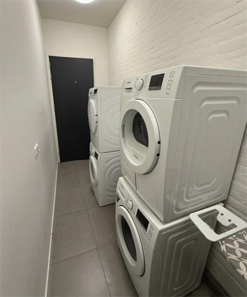 Aan het einde van de gang bevindt zich de wasruimte met wasmachines en drogers. De studio is gelegen op de begane grond en is circa 25 m2. De studio is voorzien van een hoog plafond en hoog raam. Tevens ligt er een fraaie PVC houtmotief vloer en beschikt de studio over 2 plafond armaturen, gordijnen, kunststof kozijn met ventilatierooster, Duco CO2 gestuurde ventilatie en een doorstroomapparaat (snel warm water binnen 10 seconden).