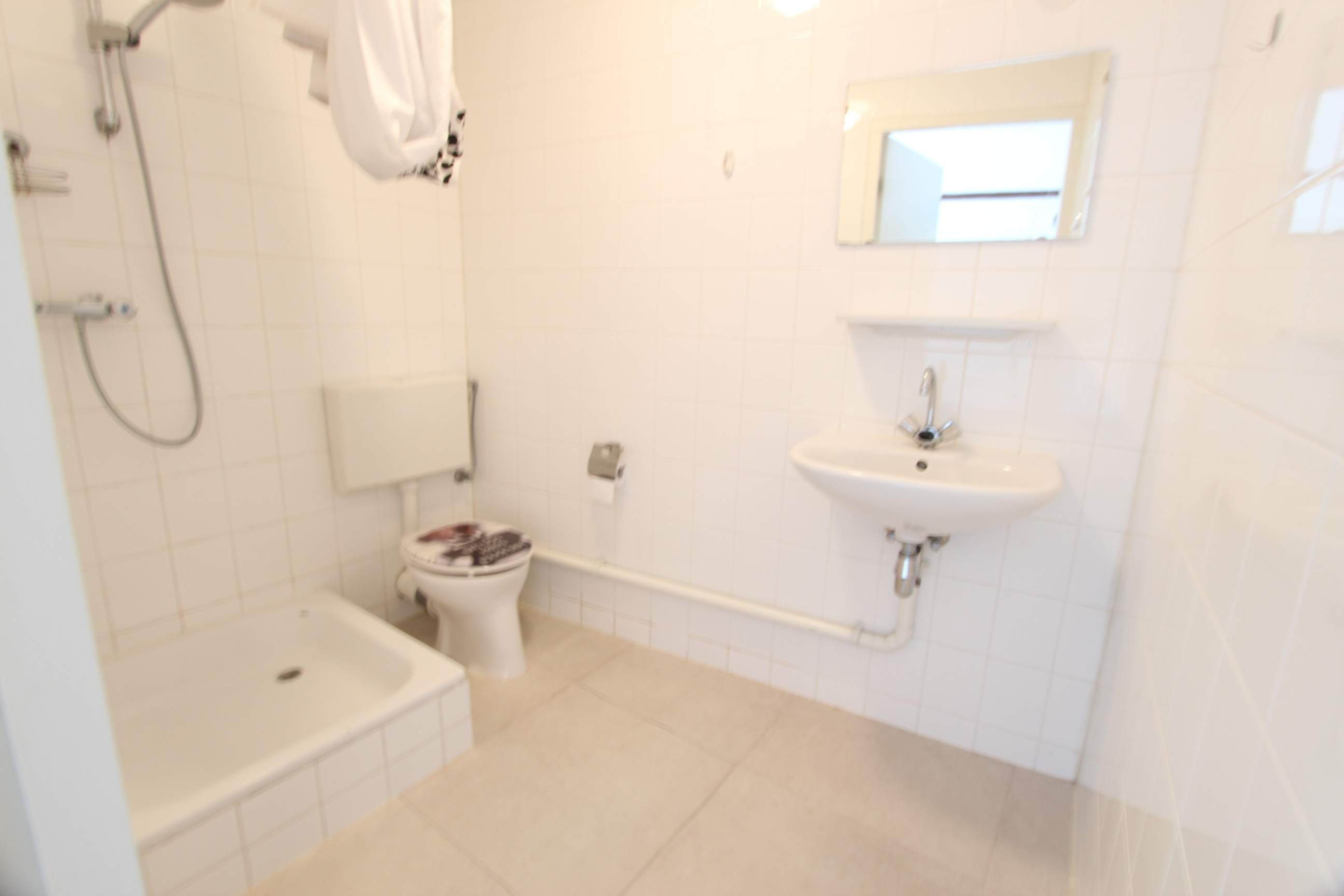 De eenvoudige, maar neutrale badkamer (ca. 5,5 m²) is voorzien van douche, wastafel en toilet. Buitenruimte: - Parkeren: openbare weg (gratis of met blauwe kaart, afhankelijk van de locatie). Overig: - Woonoppervlakte ca.